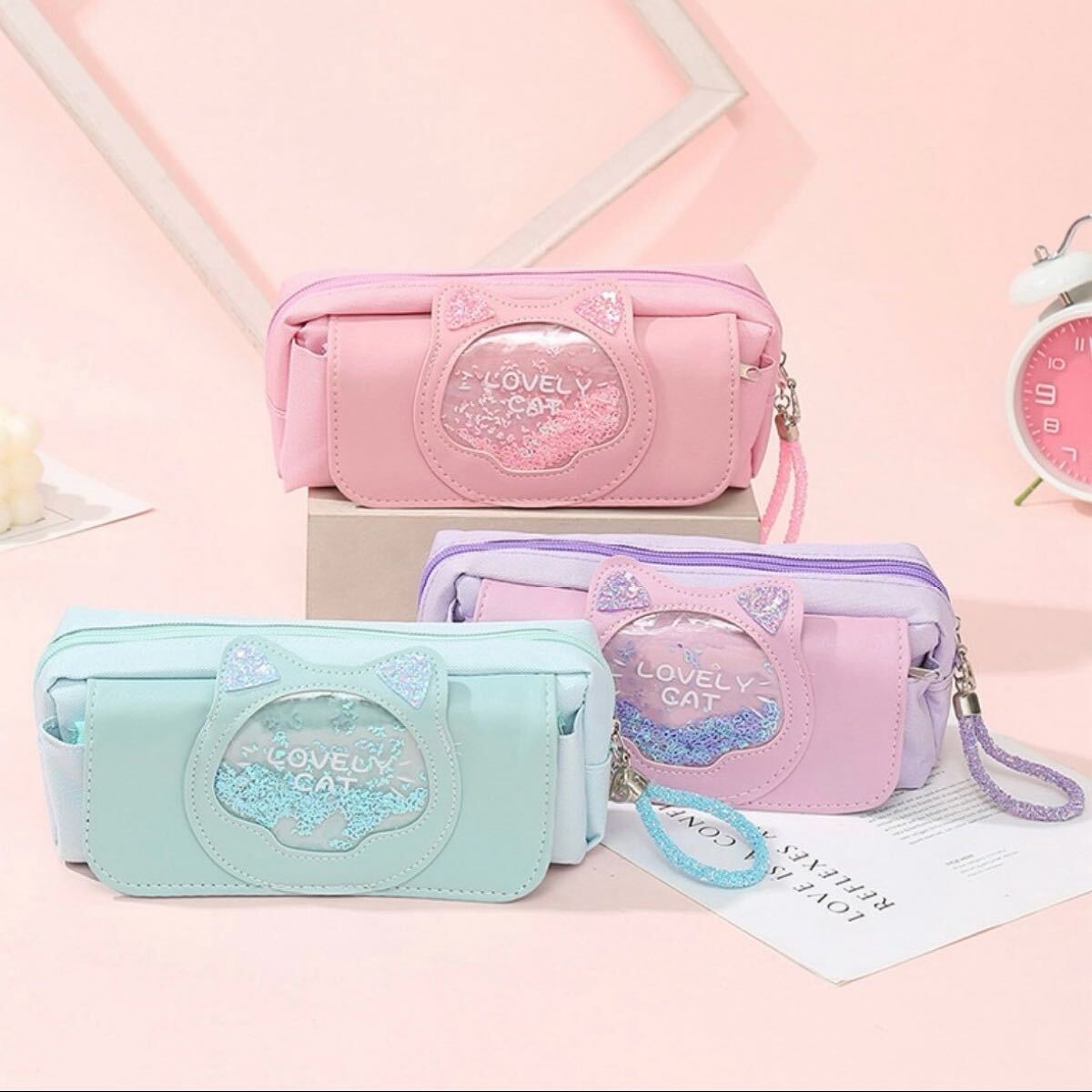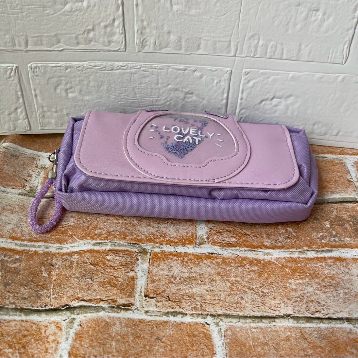 ネコのモチーフがついたかわいい筆箱です。クラスで目立つ事間違いなし!化粧ポーチとしても小物入れでも色々なシーンで大活躍です!ストラップ付きです〜