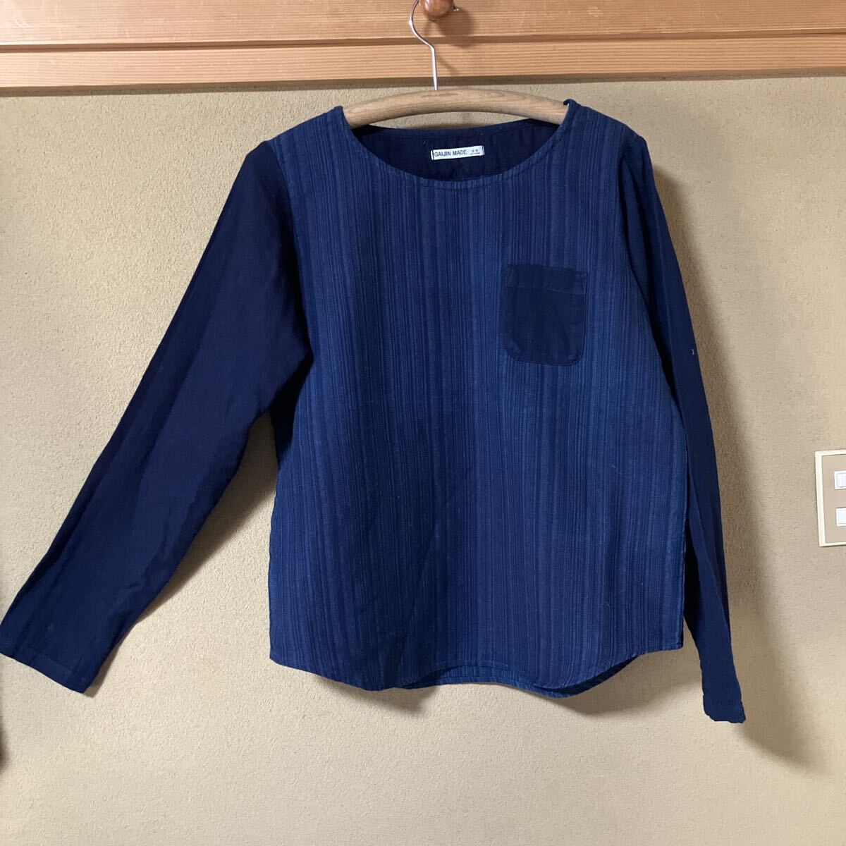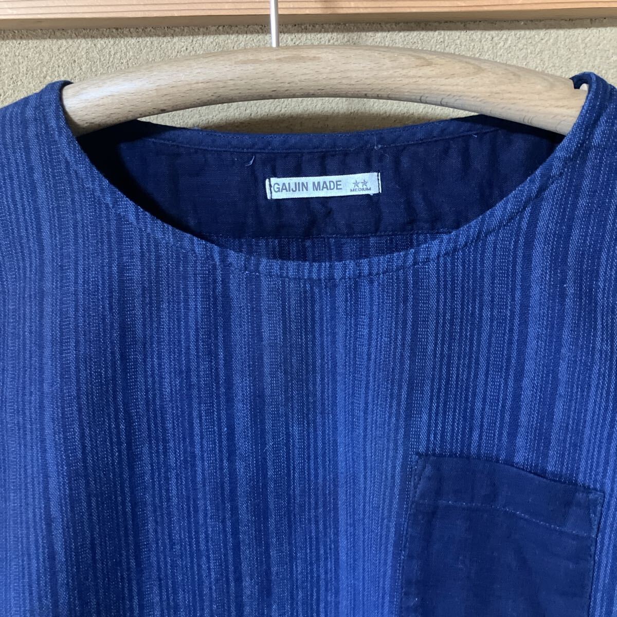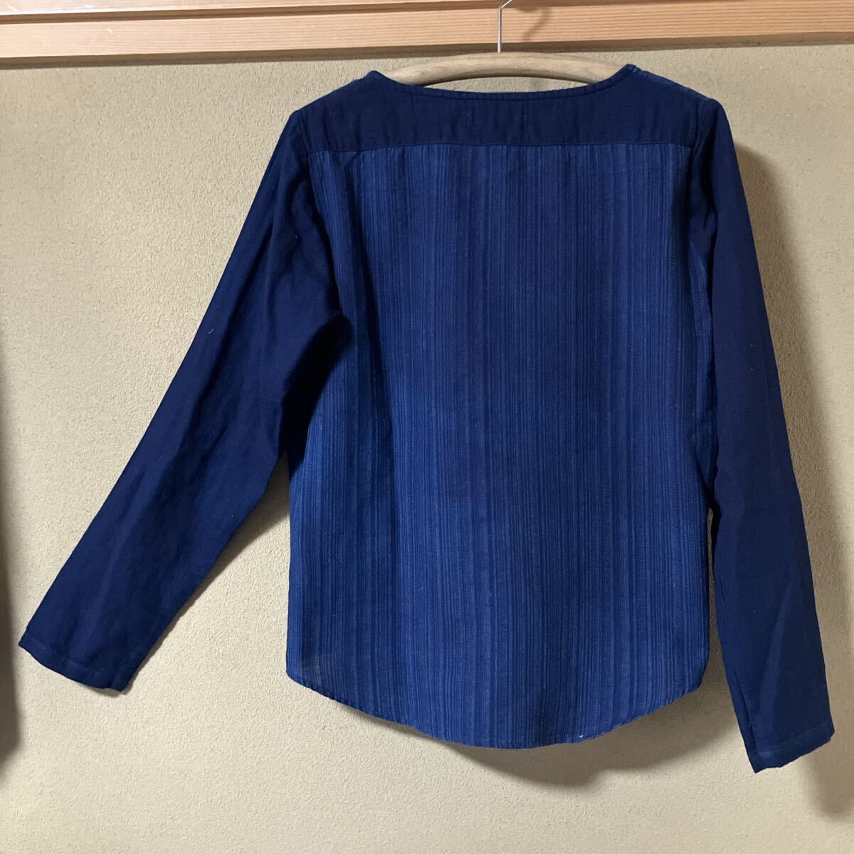 10枚目の写真の様なカラフルな細かいストライプの手織り生地を藍色に染め直しボディー本体に使用し袖から肩にはガーゼ生地で作り上げたプルオーバーシャツです。長袖のT-シャツ感覚で着用頂けばと思います。便宜上メンズと記載させて頂きましたがレディースとしても着用頂けると思います。色は藍色、サイズはMになります。