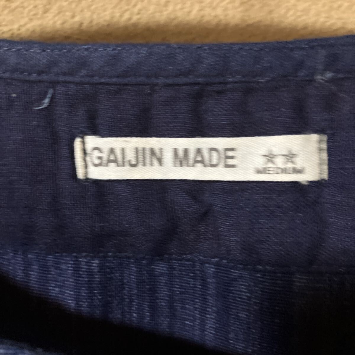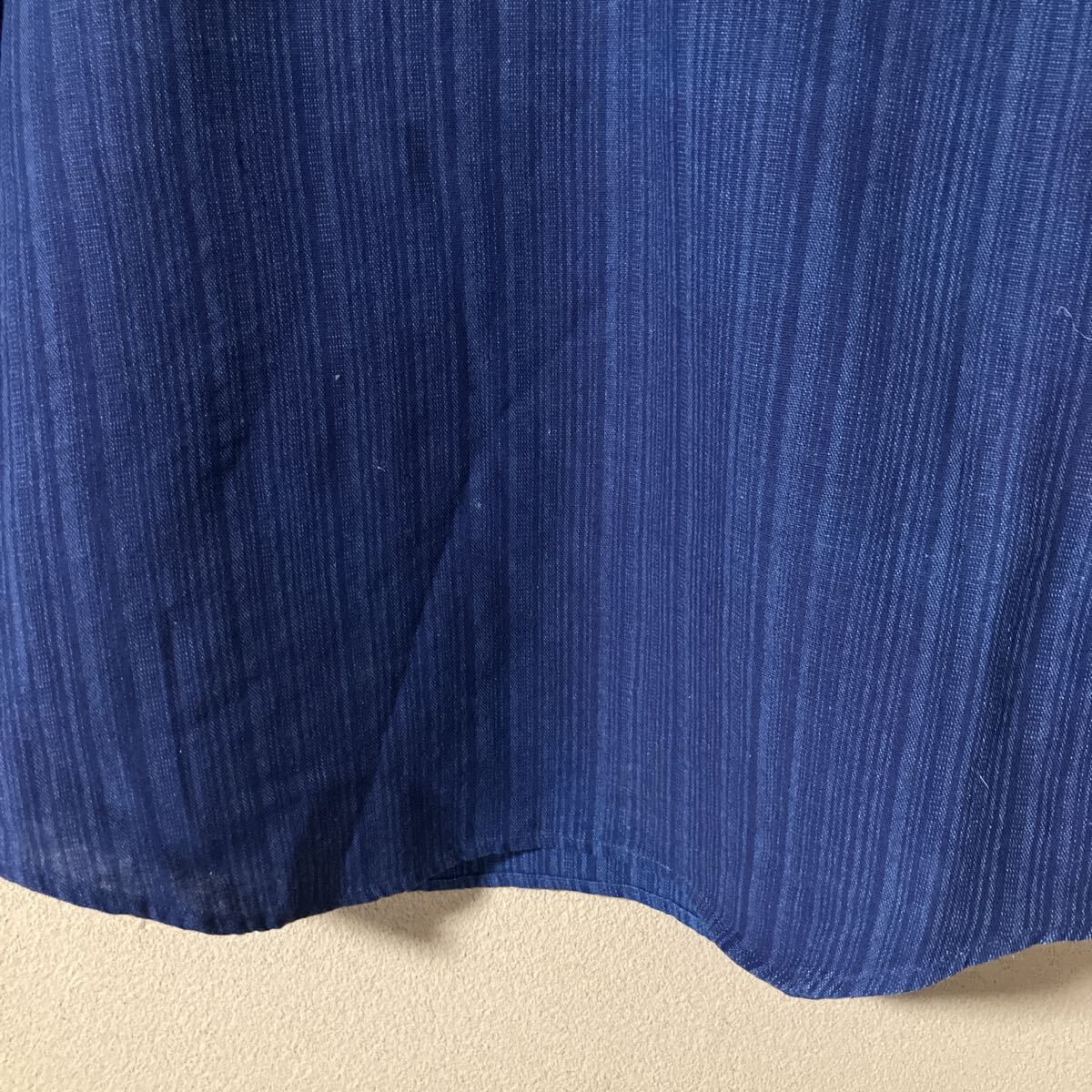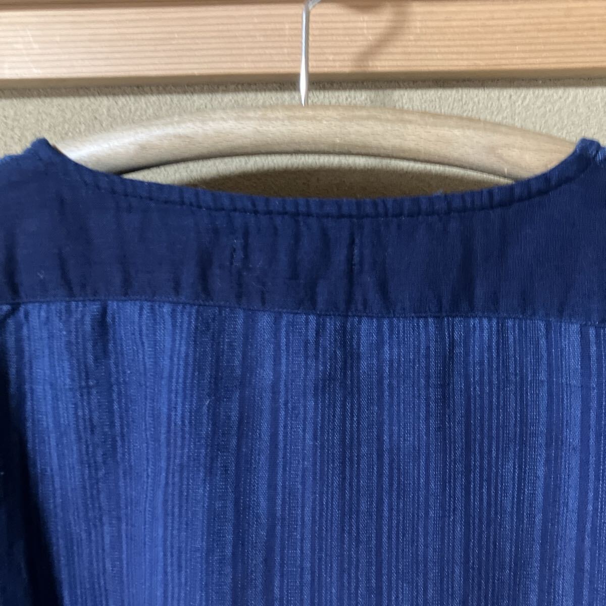 10枚目の写真の様なカラフルな細かいストライプの手織り生地を藍色に染め直しボディー本体に使用し袖から肩にはガーゼ生地で作り上げたプルオーバーシャツです。長袖のT-シャツ感覚で着用頂けばと思います。便宜上メンズと記載させて頂きましたがレディースとしても着用頂けると思います。色は藍色、サイズはMになります。