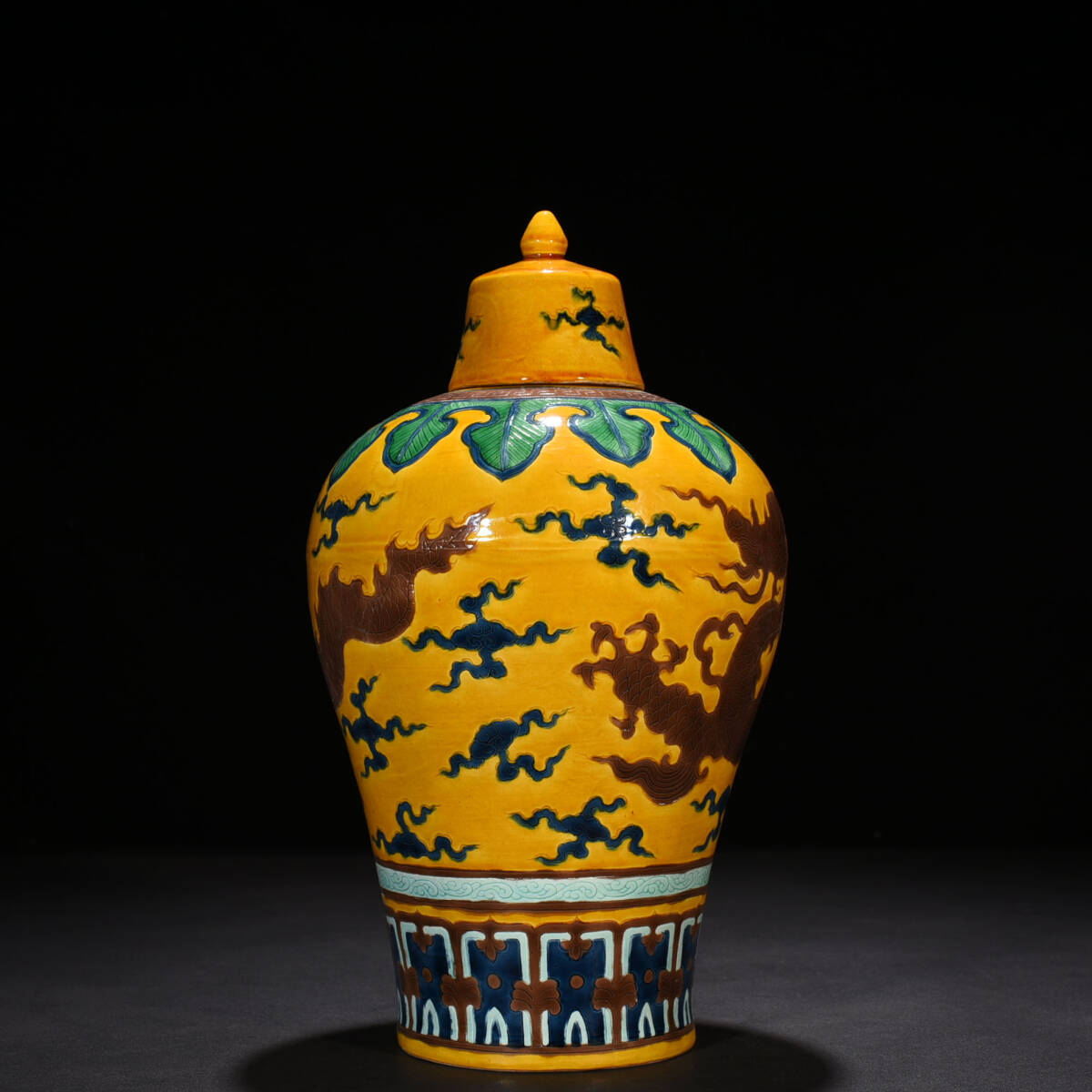 明時代 宣徳年製 黄地素三彩 彫刻龍紋梅瓶 高さ33 cm 幅19 cm 中国骨董 珍品旧蔵 古賞物 時代物 819