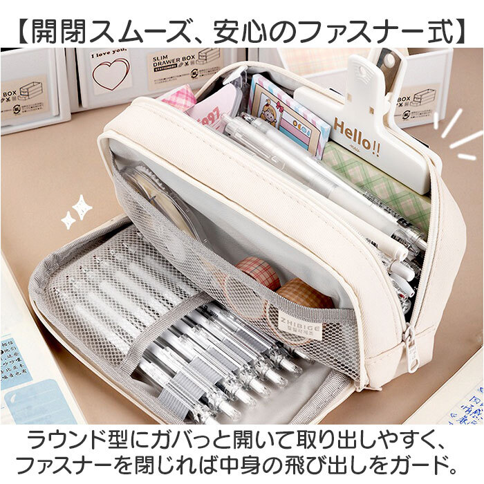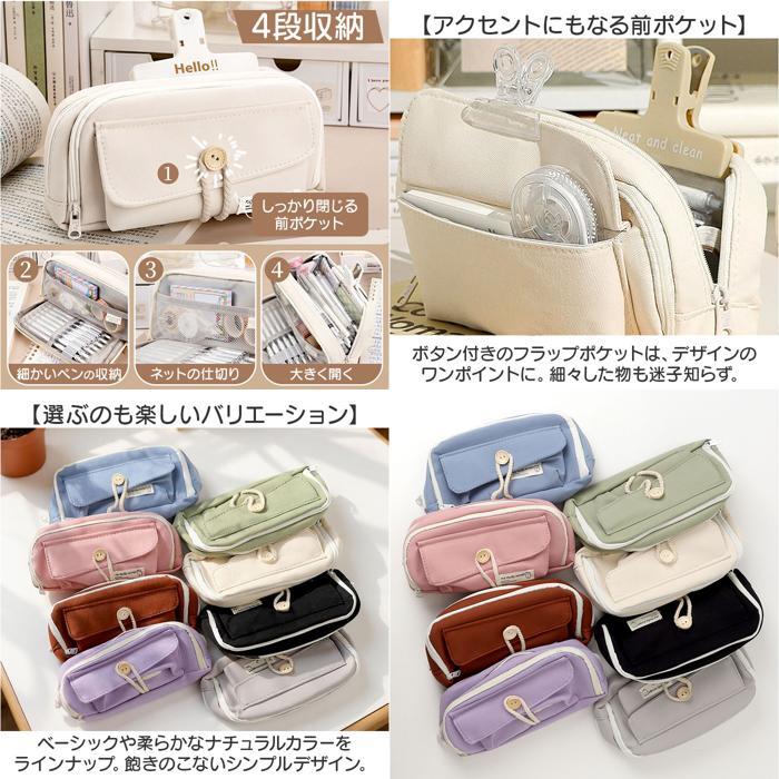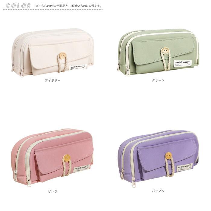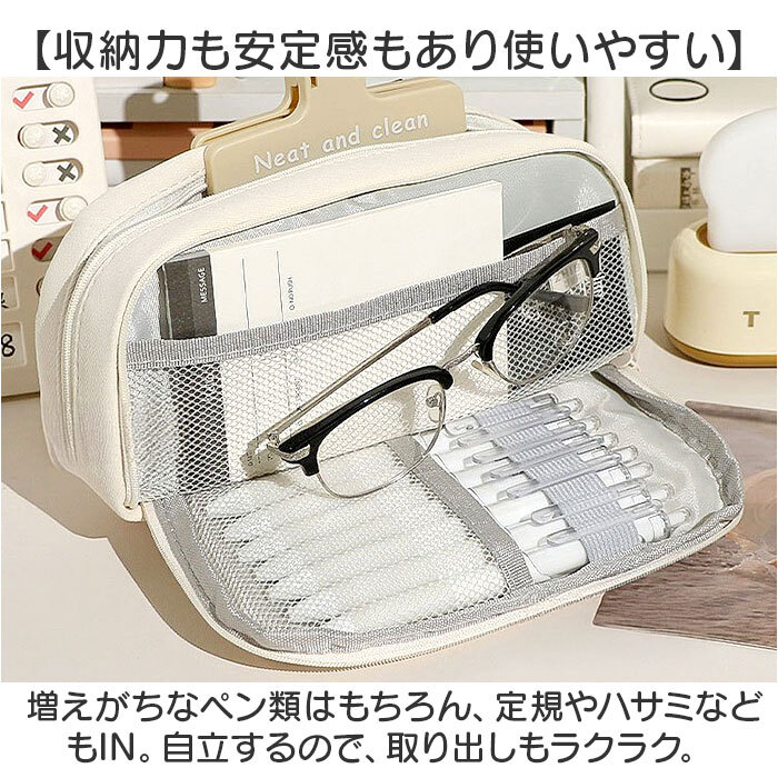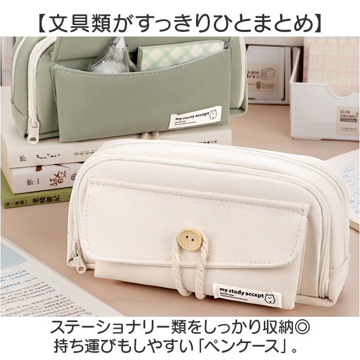商品説明 | ・・【文具類がすっきりひとまとめ】 ・ステーショナリー類をしっかり収納◎持ち運びもしやすい「ペンケース」。 ・【開閉スムーズ、安心のファスナー式】 ・ラウンド型にガバっと開いて取り出しやすく、ファスナーを閉じれば中身の飛び出しをガード。 ・【収納力も安定感もあり使いやすい】 ・増えがちなペン類はもちろん、定規やハサミなどもIN。自立するので、取り出しもラクラク。 ・【サッと取り出せるサブルーム】 ・メインと同じくラウンド型にオープン。ポケット付きで、修正テープやペンも見やすく整頓。 ・【アクセントにもなる前ポケット】 ・ボタン付きのフラップポケットは、デザインのワンポイントに。細々した物も迷子知らず。 ・【選ぶのも楽しいバリエーション】 ・ベーシックや柔らかなナチュラルカラーをラインナップ。飽きのこないシンプルデザイン。 ・【ポケット仕様】 ・サブルーム:メッシュポケット×1、メッシュ仕様のペンホルダー×1(ゴムベルト付き) ・前面:ボタン付きフラップポケット×1 |