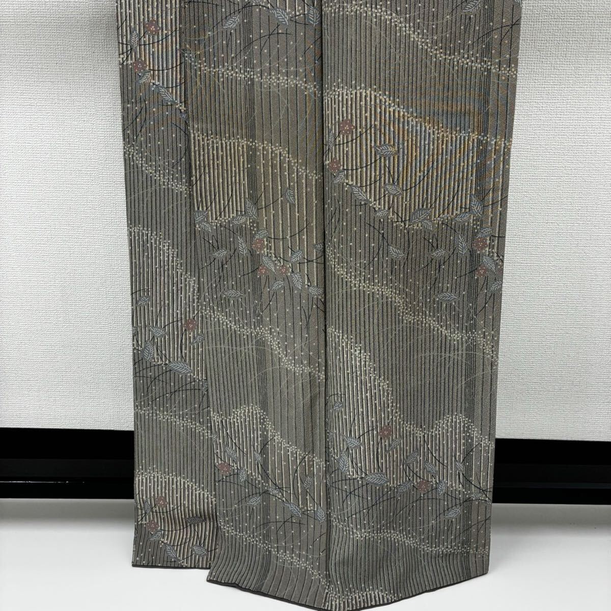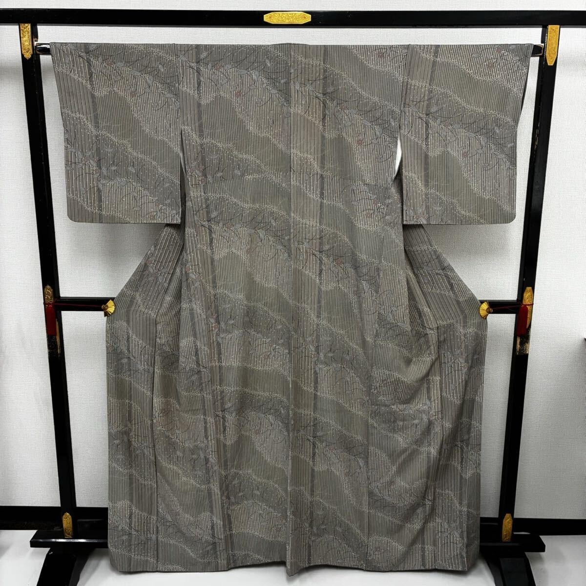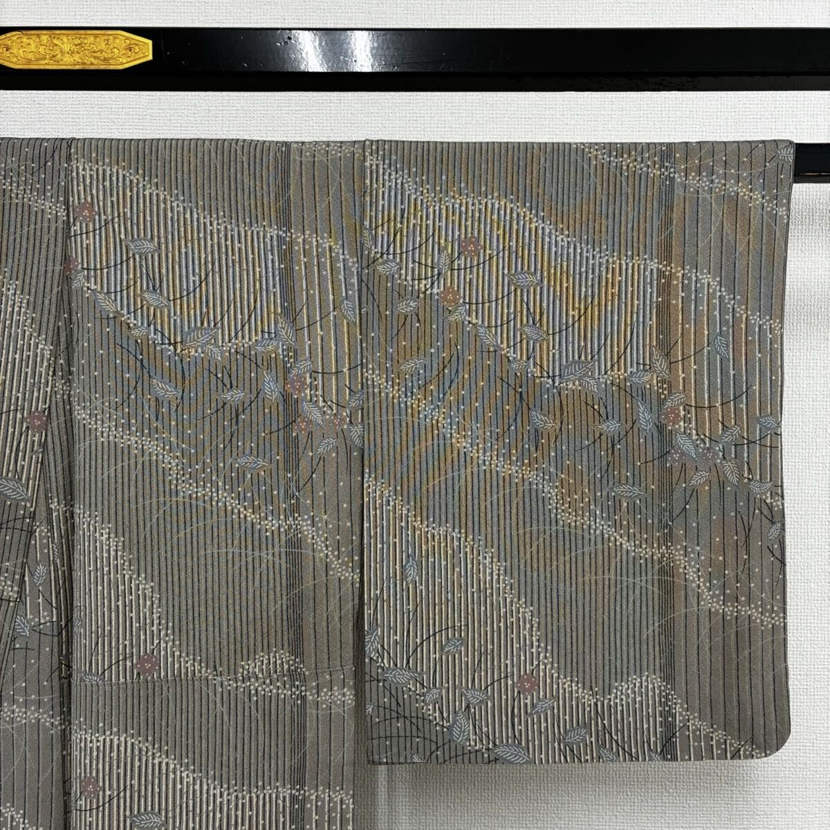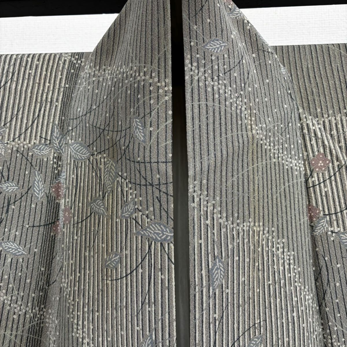 【楓】小紋 正絹 芝草 ストライプに葉っぱ模様 広衿 袷 着物 kk-011