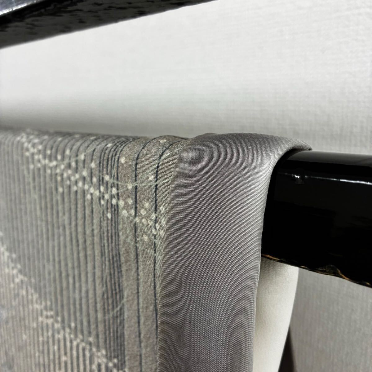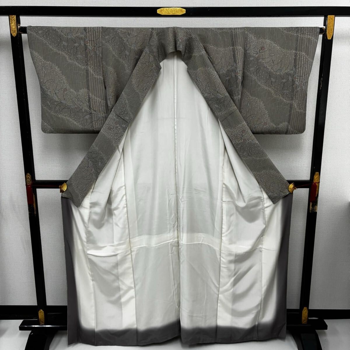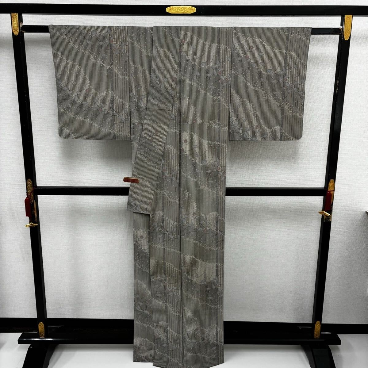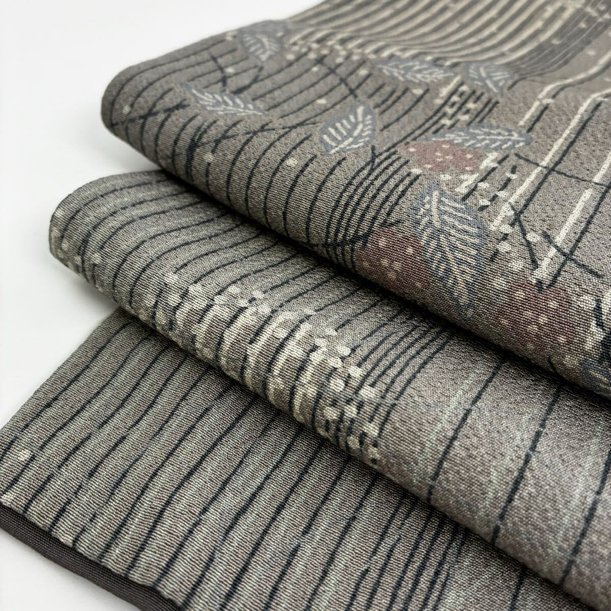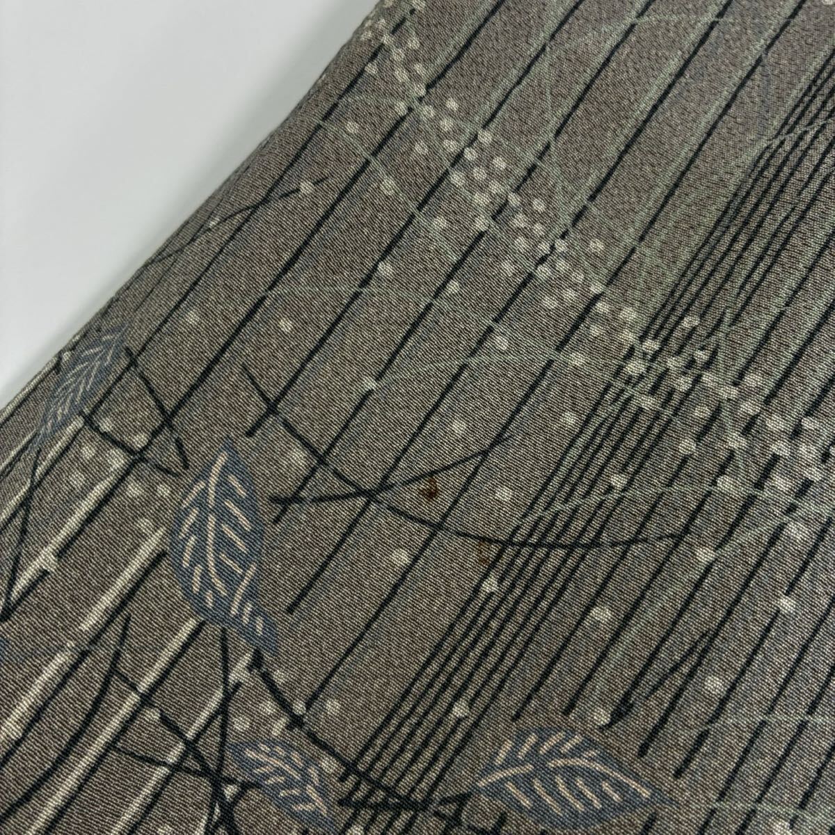【楓】小紋 正絹 芝草 ストライプに葉っぱ模様 広衿 袷 着物 kk-011