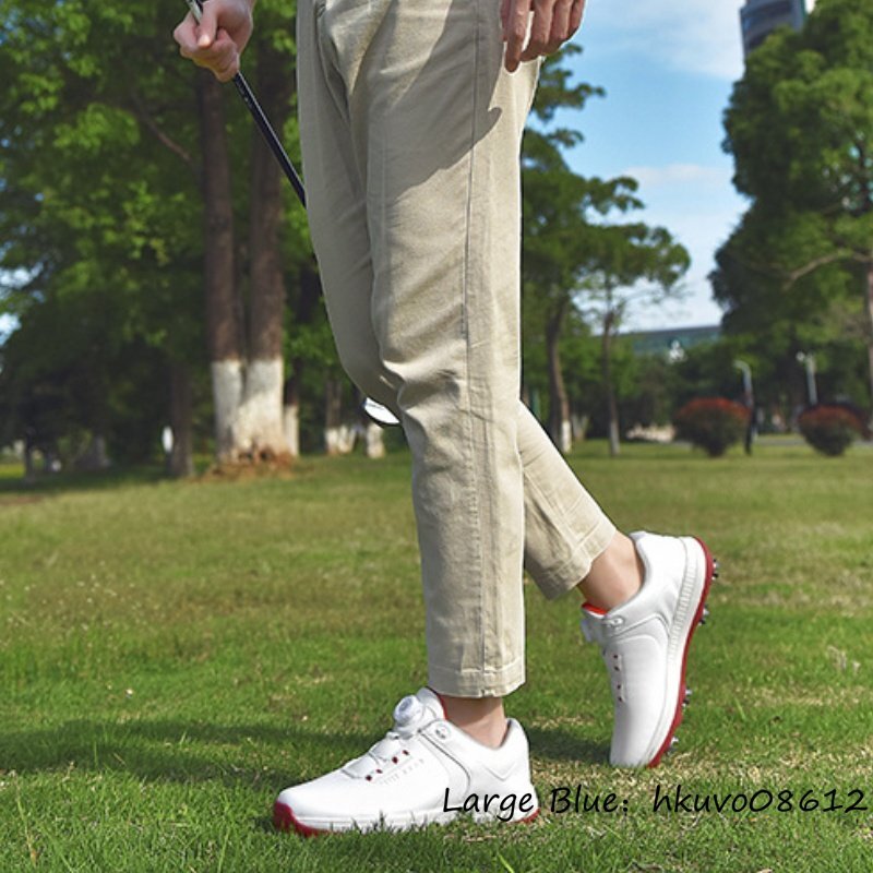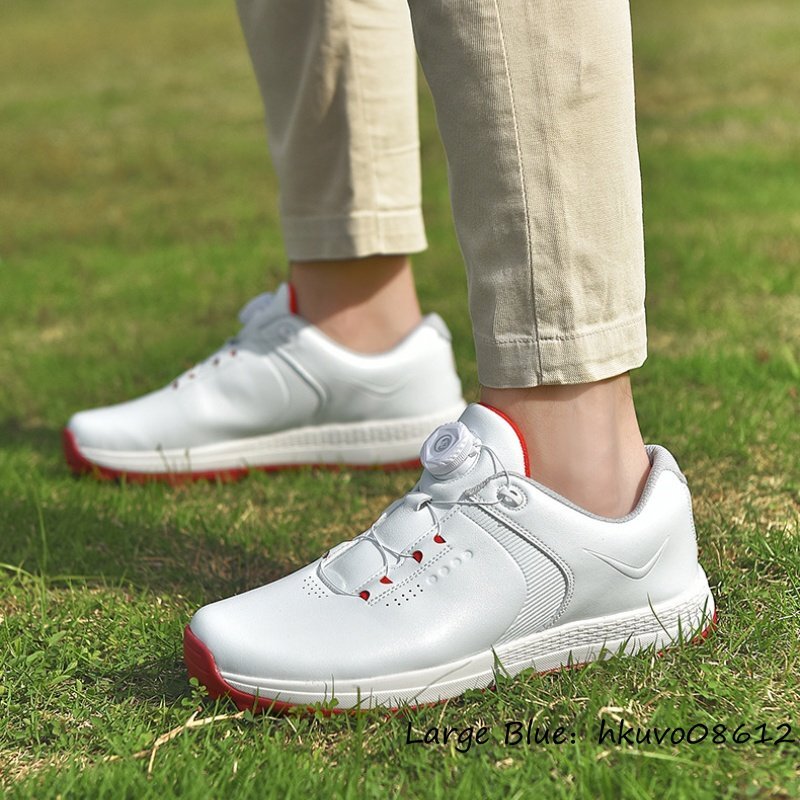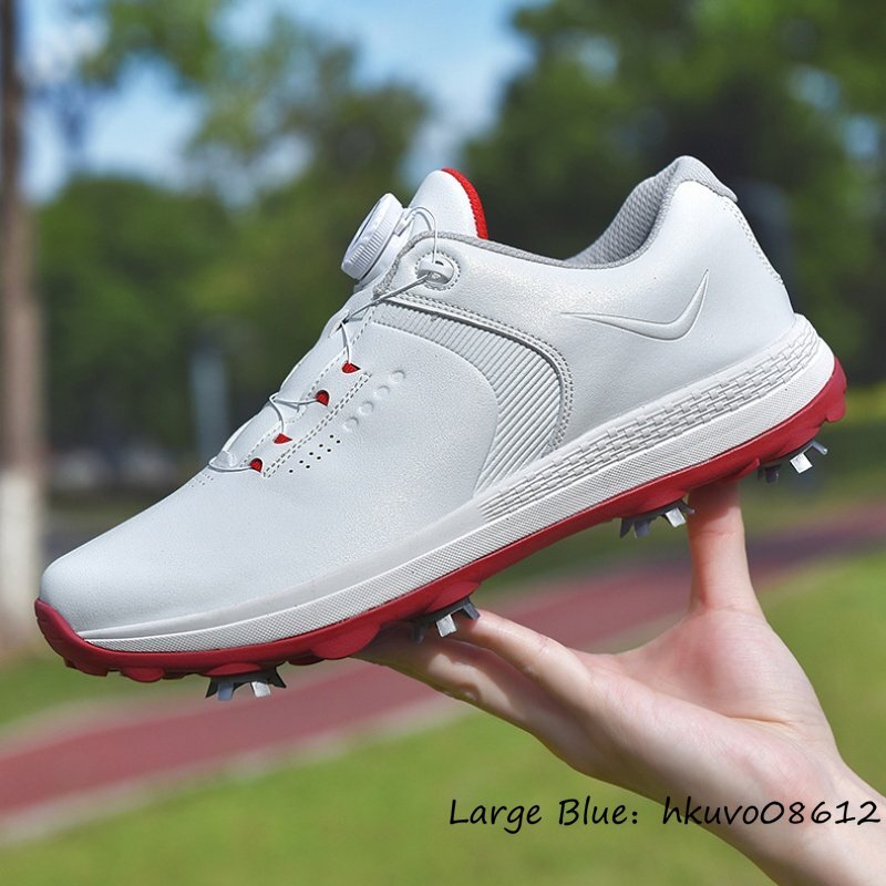 超希少★メンズ ゴルフシューズ 強いグリップ 運動靴 ダイヤル式 スニーカー スポーツシューズ フィット感 防滑耐磨 撥水幅広 白/赤 25.5cm