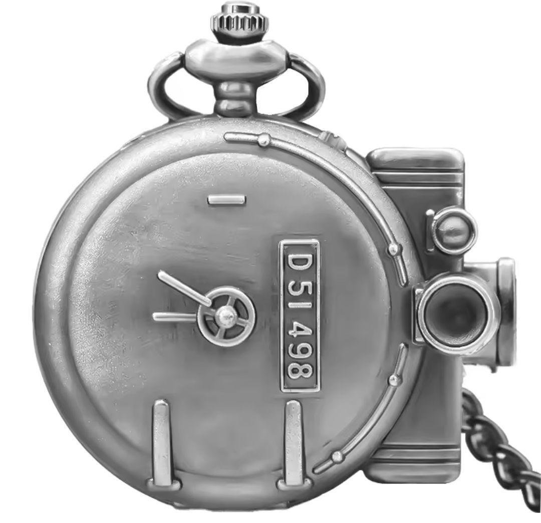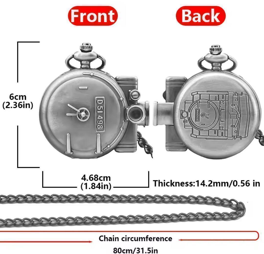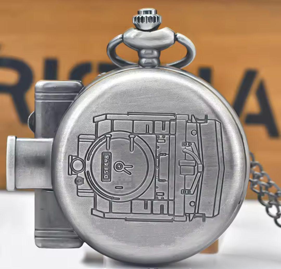 蒸気機関車デザインのブロンズ懐中時計、ローマ数字の文字盤とチェーン付き。