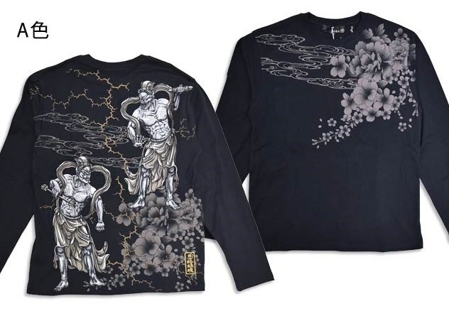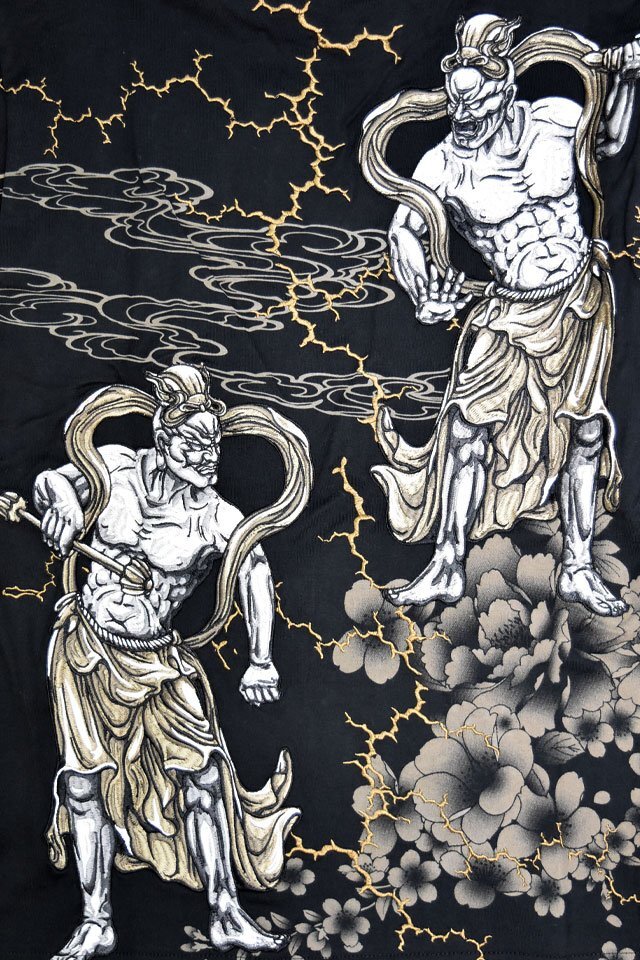絡繰魂さんから「粋 仁王雷豪ロングTシャツ(253072)」のご紹介です。 重みすら感じるほどの刺繍量が魅力的な粋シリーズから、最新作が登場しました。 今回モチーフの主役に採用されたのは、迫力満点の仁王。 背中には対になるような形で仁王をダイナミックに落とし込みました。 周囲の稲妻は刺繍、背景の流水と桜はプリントでそれぞれ表現しました。 裾にはブランドロゴが印風に刺繍されています。 ボディーには、刺繍に負けないコシのある綿100%の生地を使用。 | |||||||||||||||||||||||||