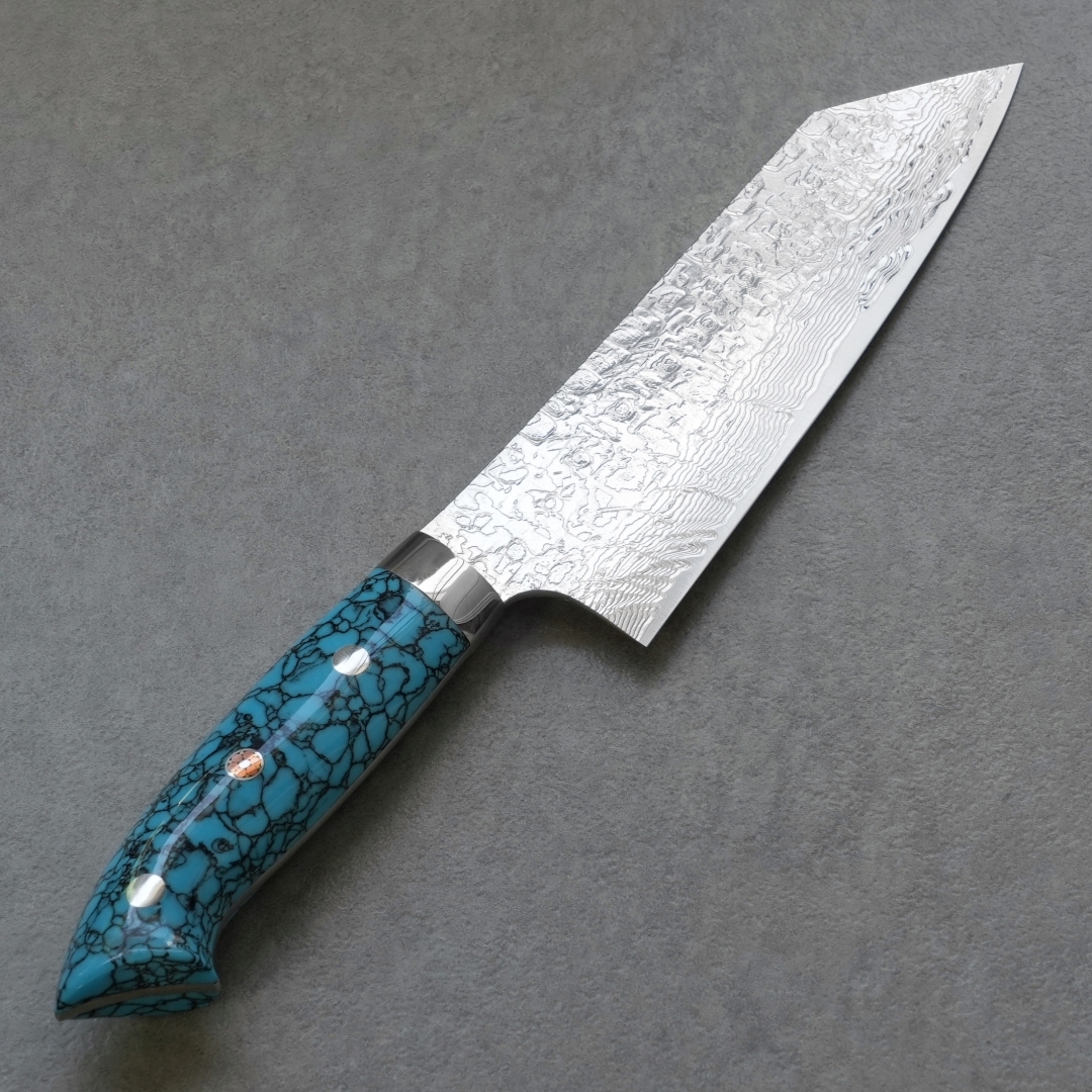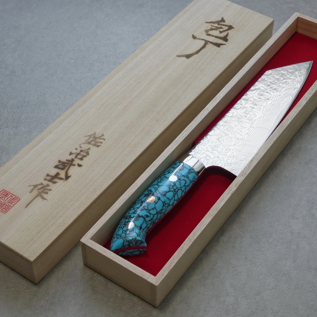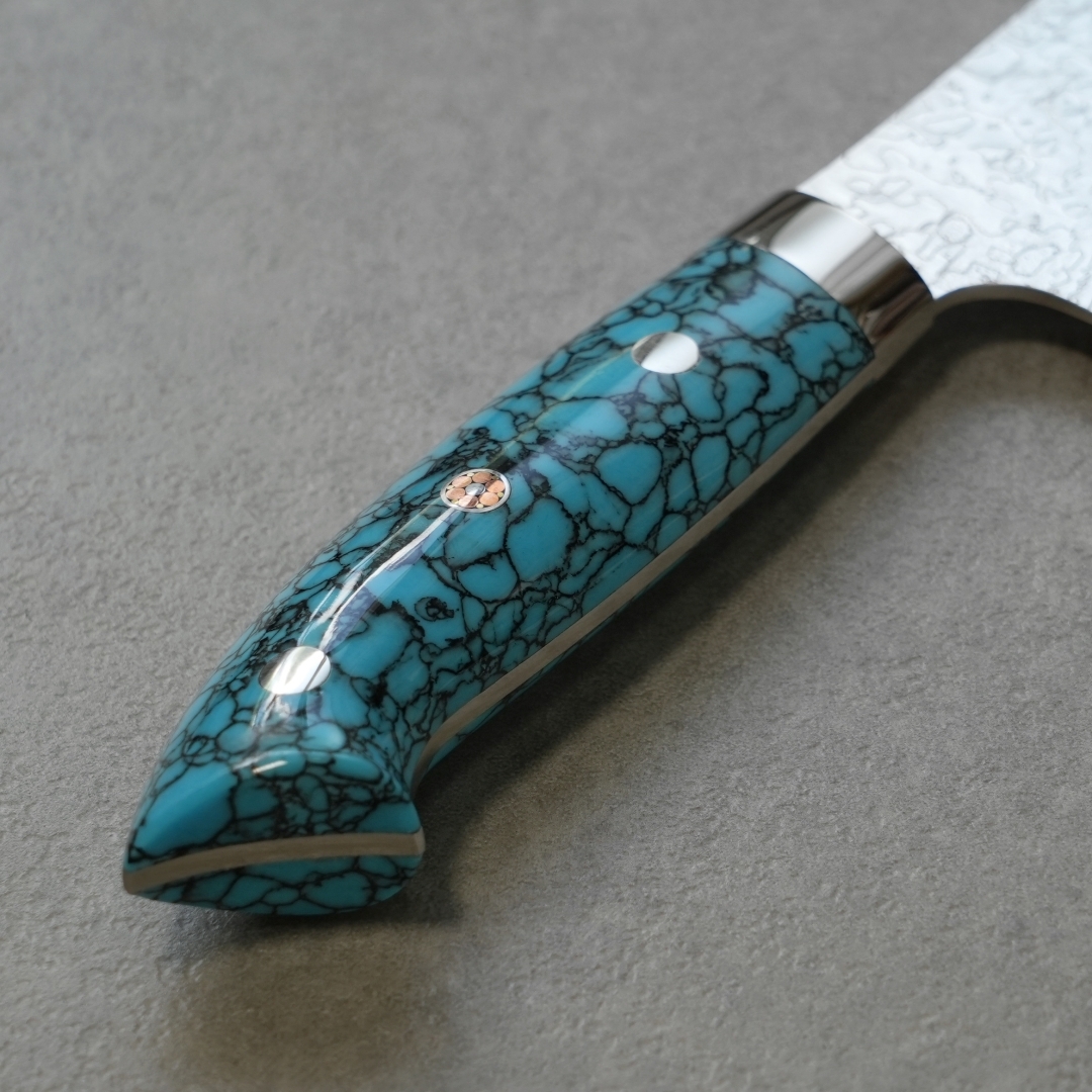 目を引く人工のブルーターコイズは耐久性や耐水性も優れ、伝統的工芸品としての包丁に更に華を添えています。ハンドルの形状は手にフィットするように一本一本職人の手によって削り出され、非常に手間をかけて作りあげられています。
