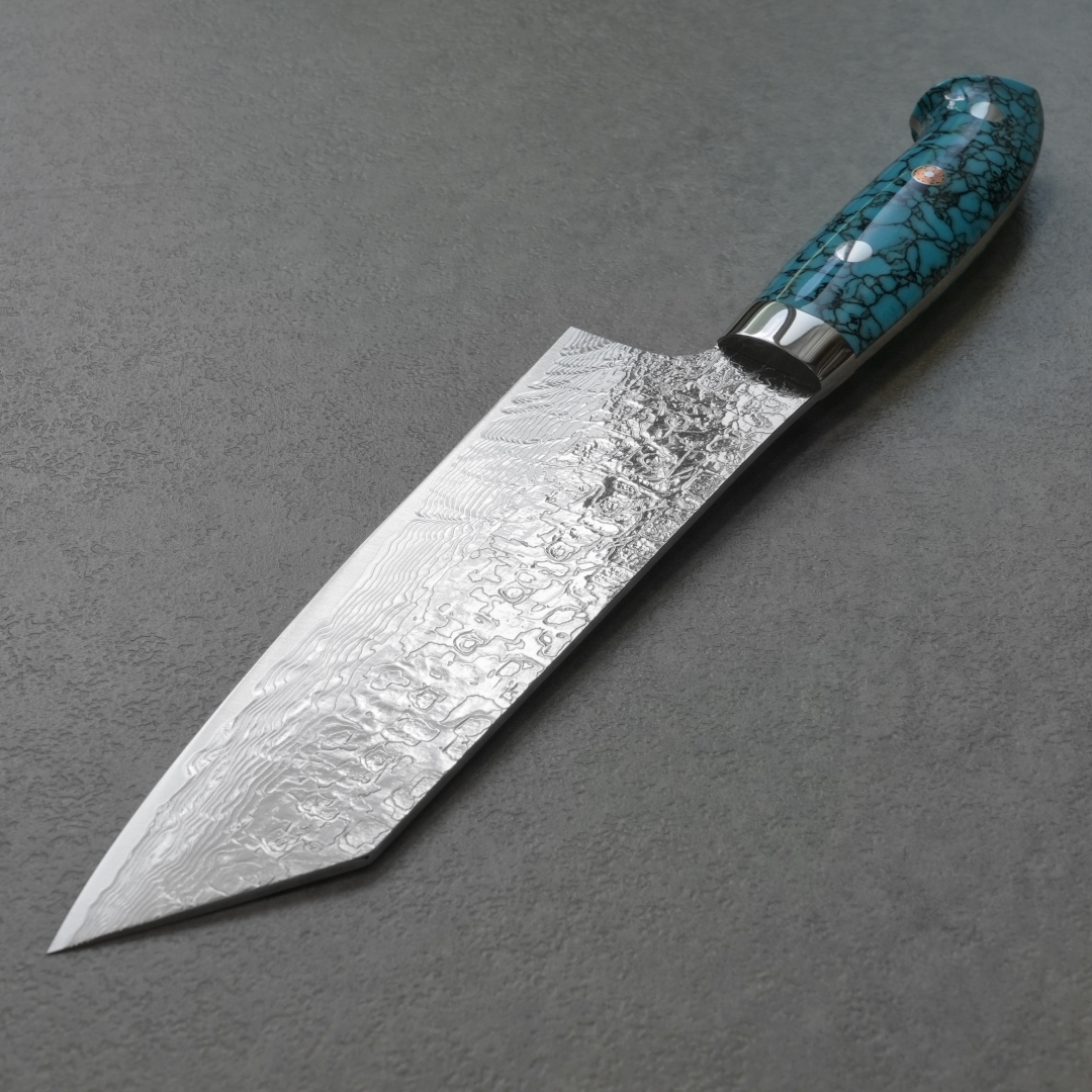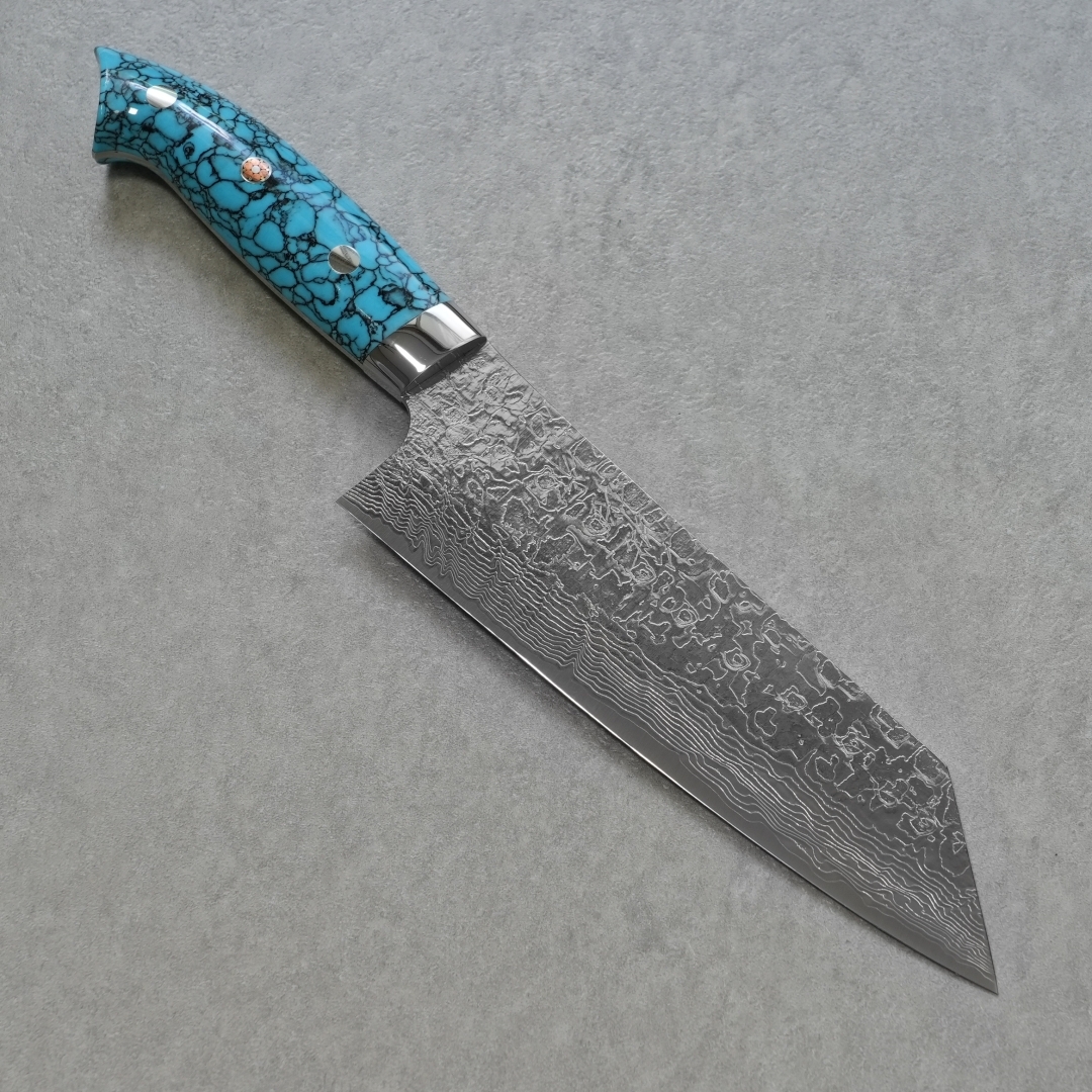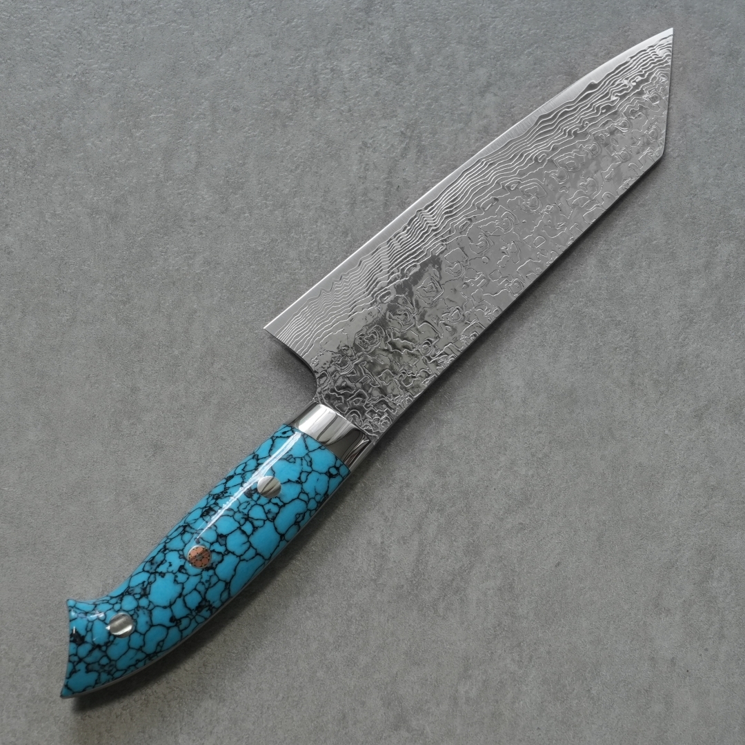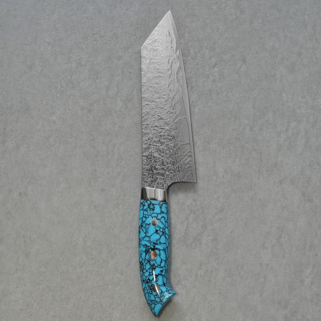 目を引く人工のブルーターコイズは耐久性や耐水性も優れ、伝統的工芸品としての包丁に更に華を添えています。ハンドルの形状は手にフィットするように一本一本職人の手によって削り出され、非常に手間をかけて作りあげられています。