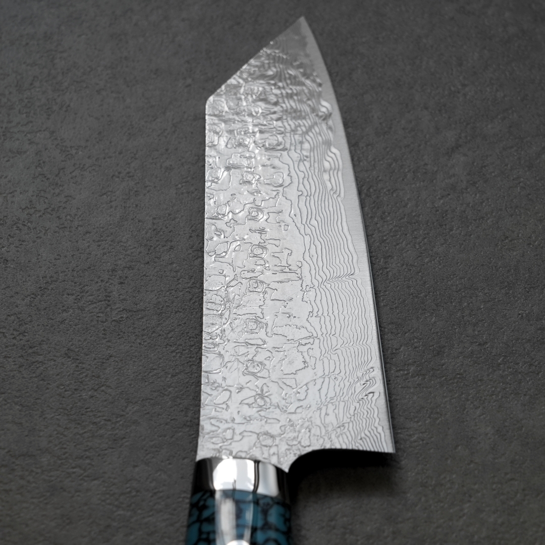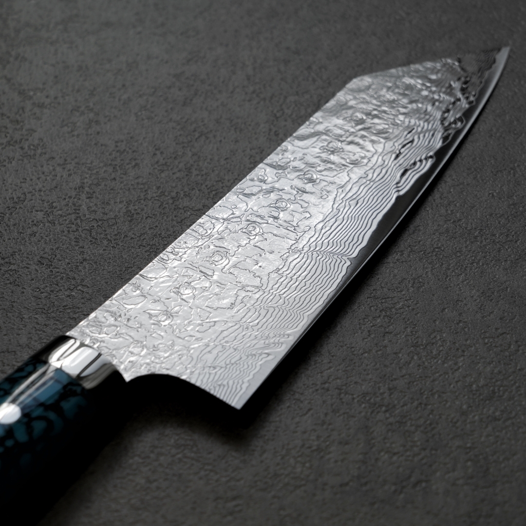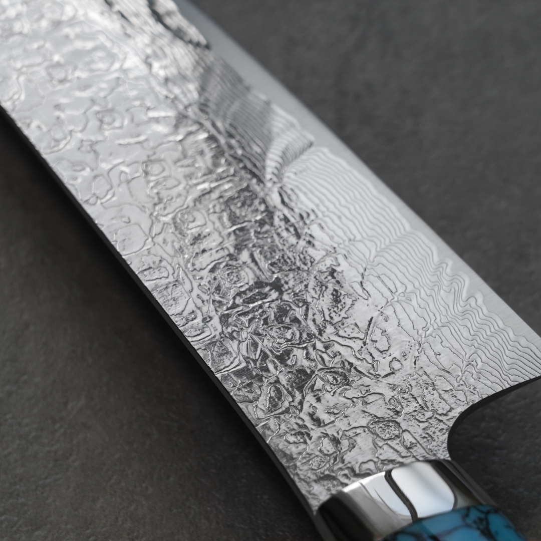 この包丁にはダイヤモンドを彷彿とさせるダイヤ仕上げが施されています。これにより表面に美しい模様が施されており、食材を切る際に刃に食材が貼りつきにくくなります。エレガントで繊細な模様のこの包丁は、まさに芸術作品と呼んでも過言ではないでしょう。