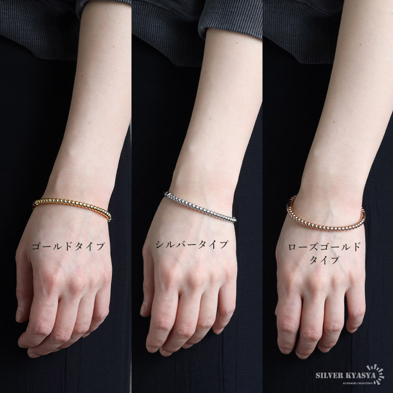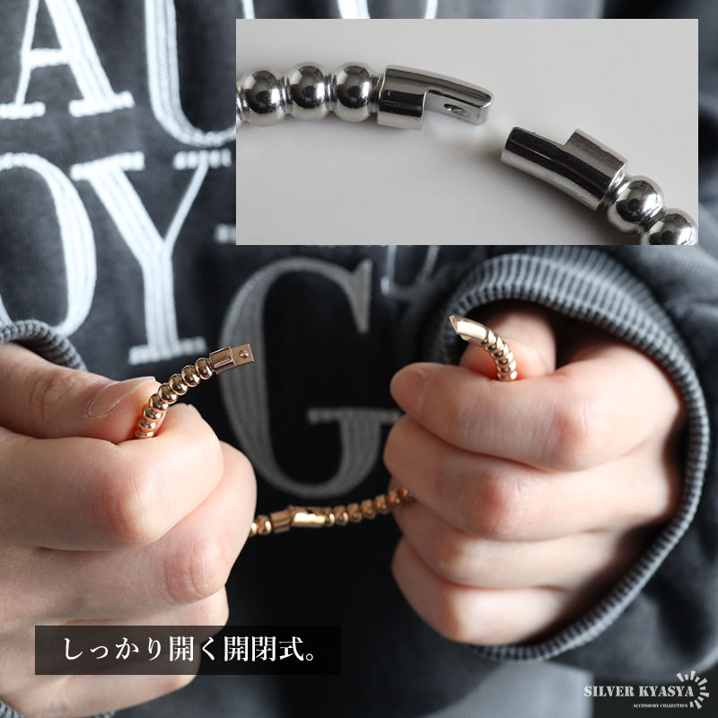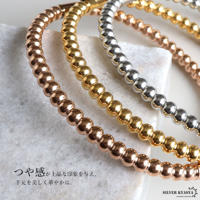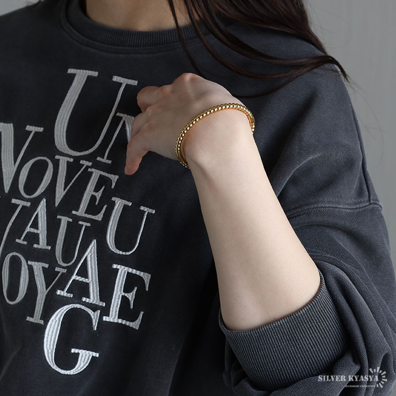 ぷっくりとしたメタルボールを繋げた優しげなフォルムが魅力のバングル。シンプルで普段使いにおすすめのアイテムです。