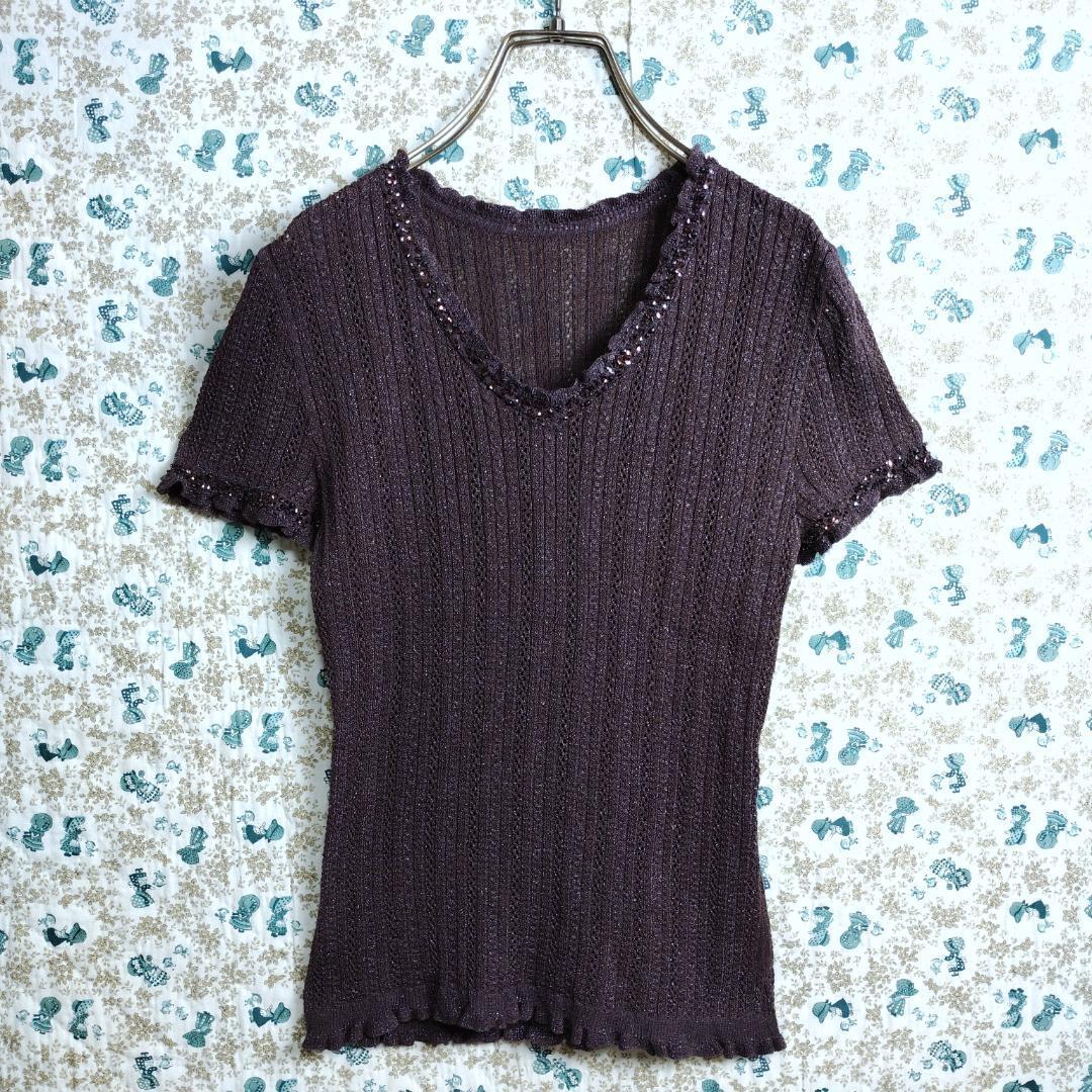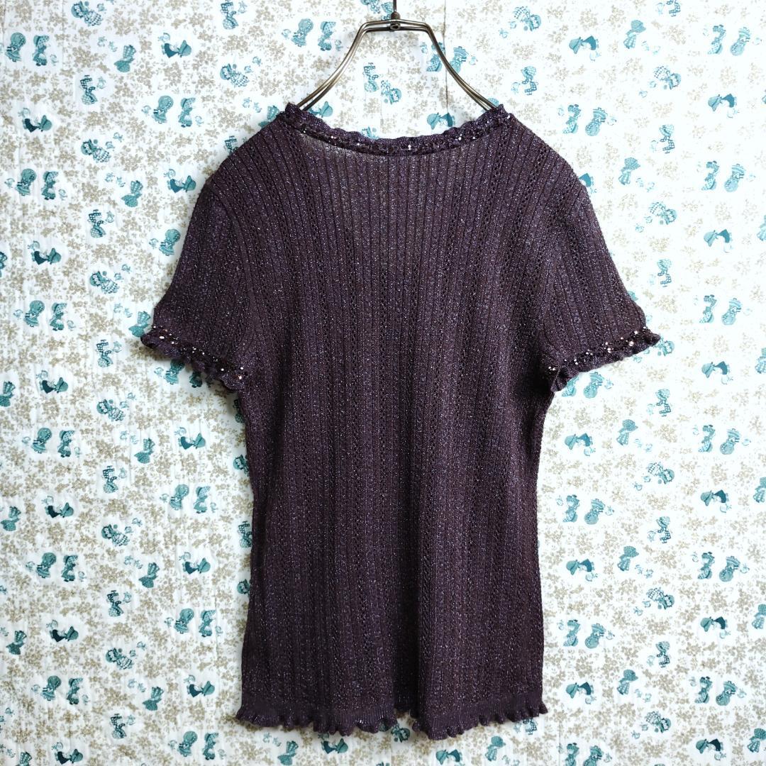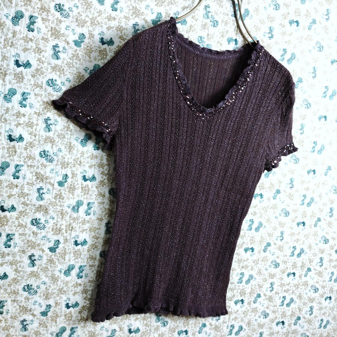 レリアン☆Leilian サマーニット カットソー Tシャツ 半袖 Vネック プルオーバー 透かし編み レーヨン混 ビーズ ラメ パープル 紫 11号 L