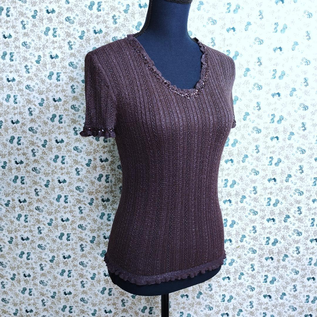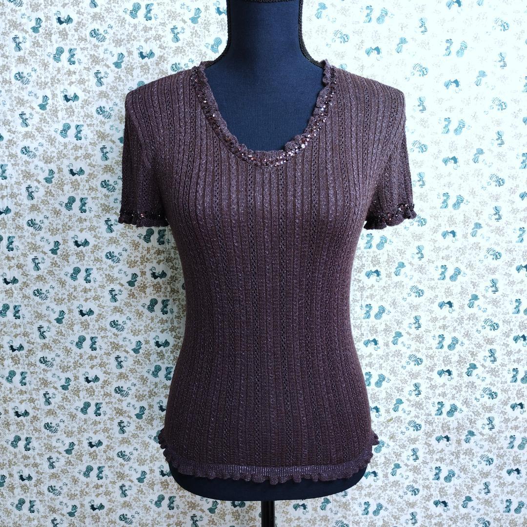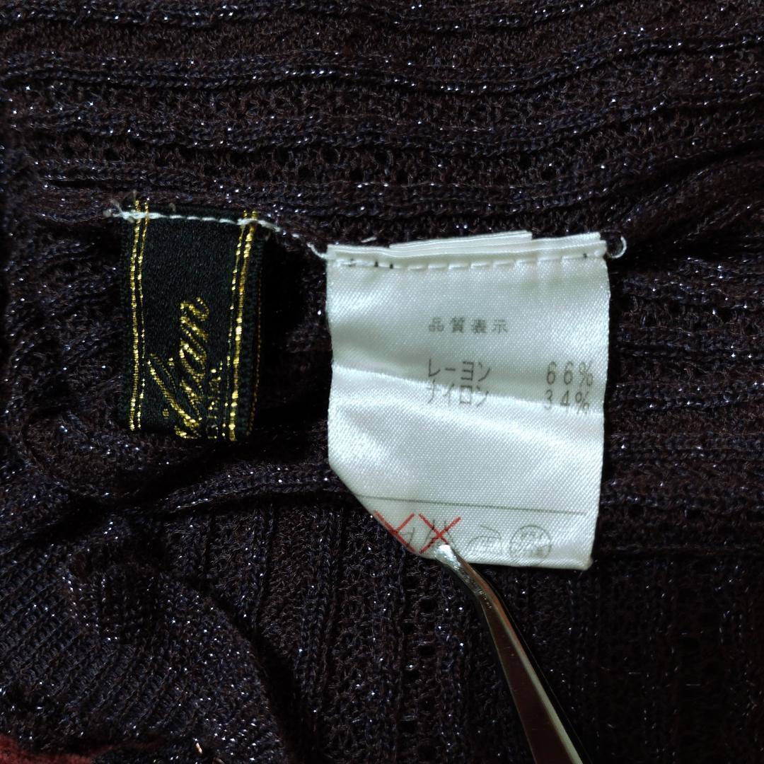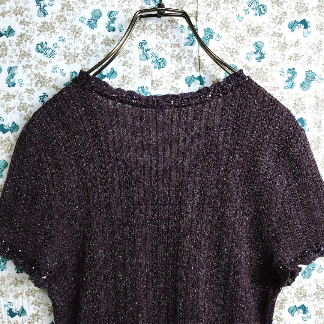 レリアン☆Leilian サマーニット カットソー Tシャツ 半袖 Vネック プルオーバー 透かし編み レーヨン混 ビーズ ラメ パープル 紫 11号 L