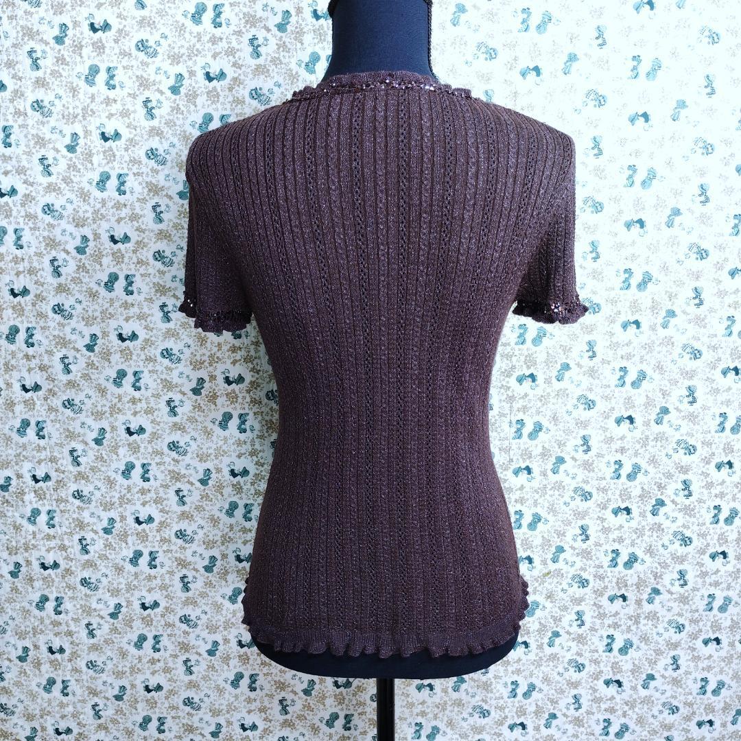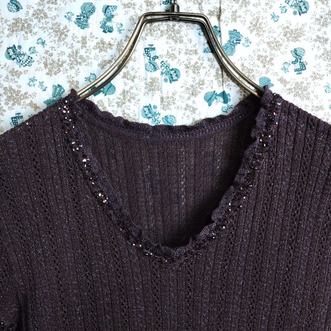 Leilian サマーニット デザインシャツ Tシャツ カットソー Vネック プルオーバー 半袖 透かし編み ビーズ ラメ フリル 上品 華やか 薄手 おしゃれ かわいい かっこよい