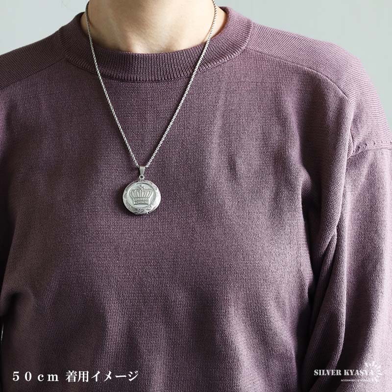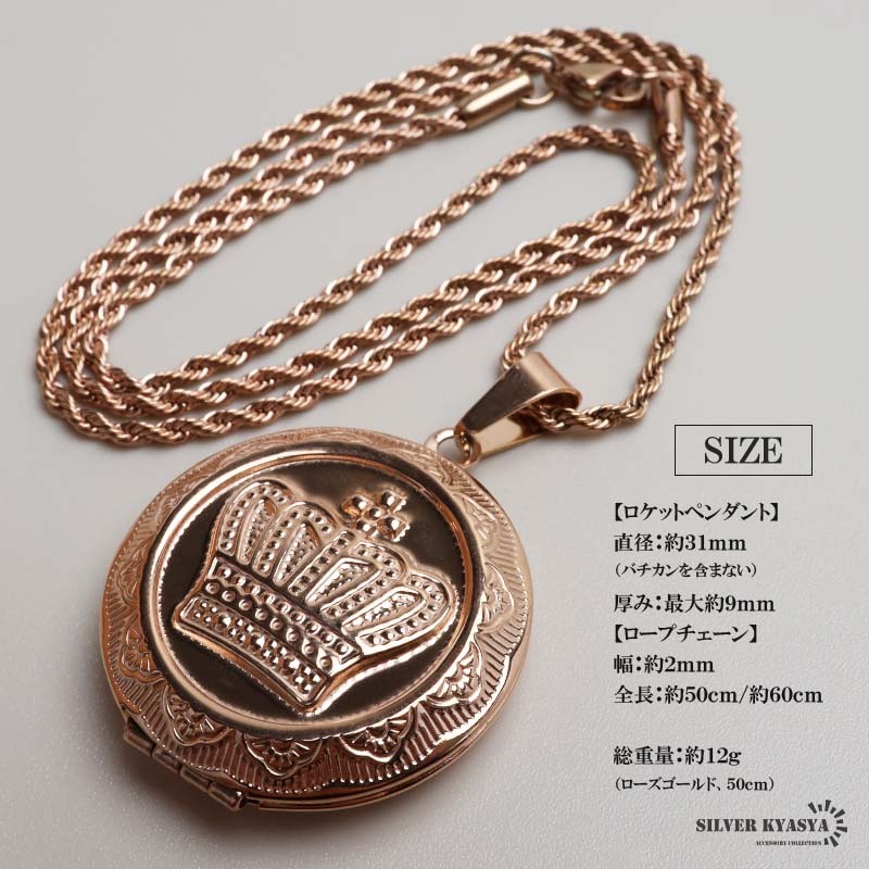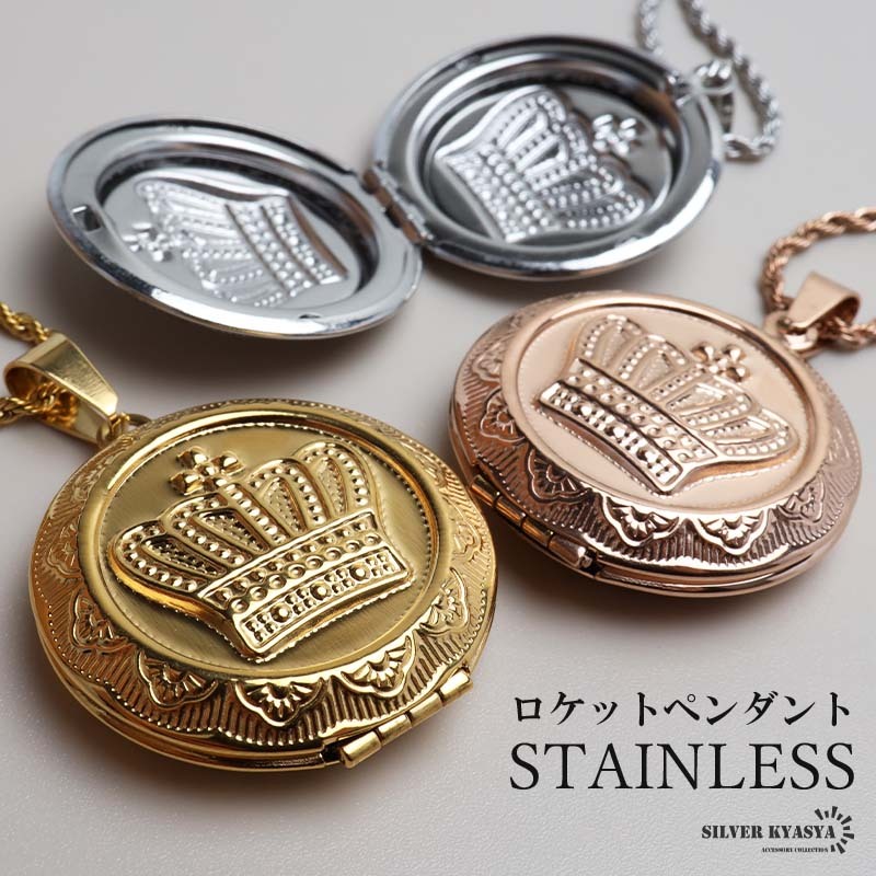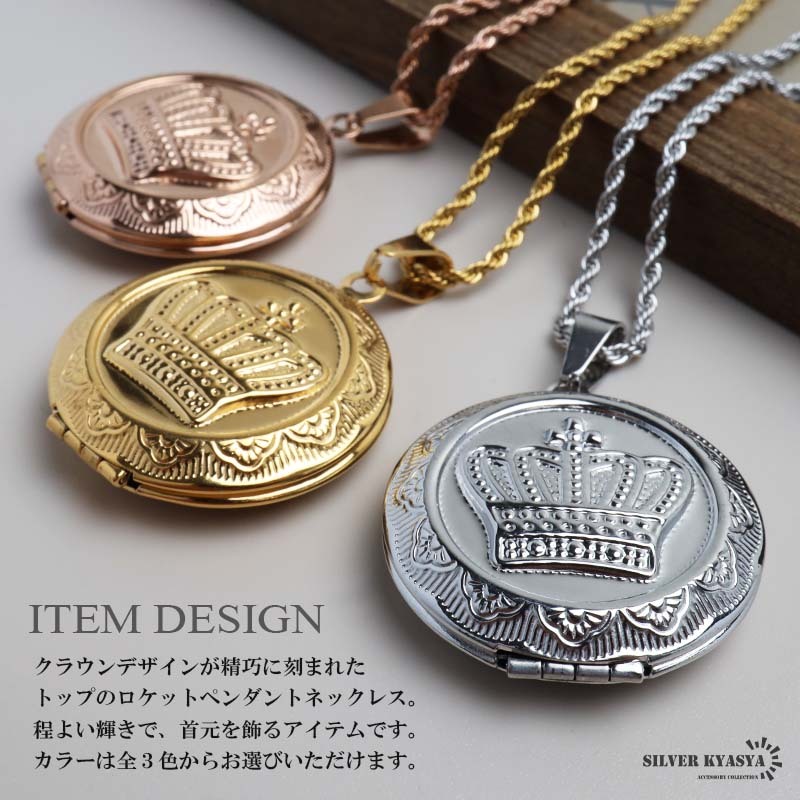 クラウンデザインが精巧に刻まれたトップのロケットペンダントネックレス。程よい輝きで、首元を飾るアイテムです。カラーは全3色からお選びいただけます。