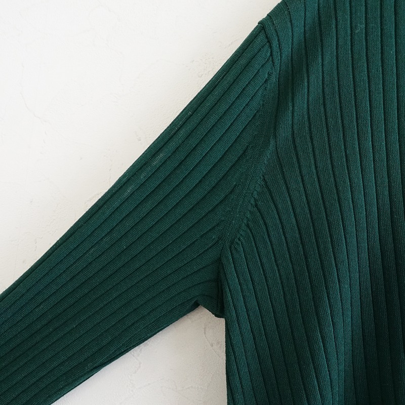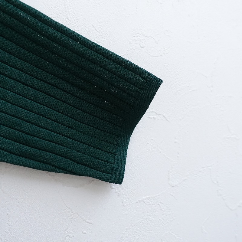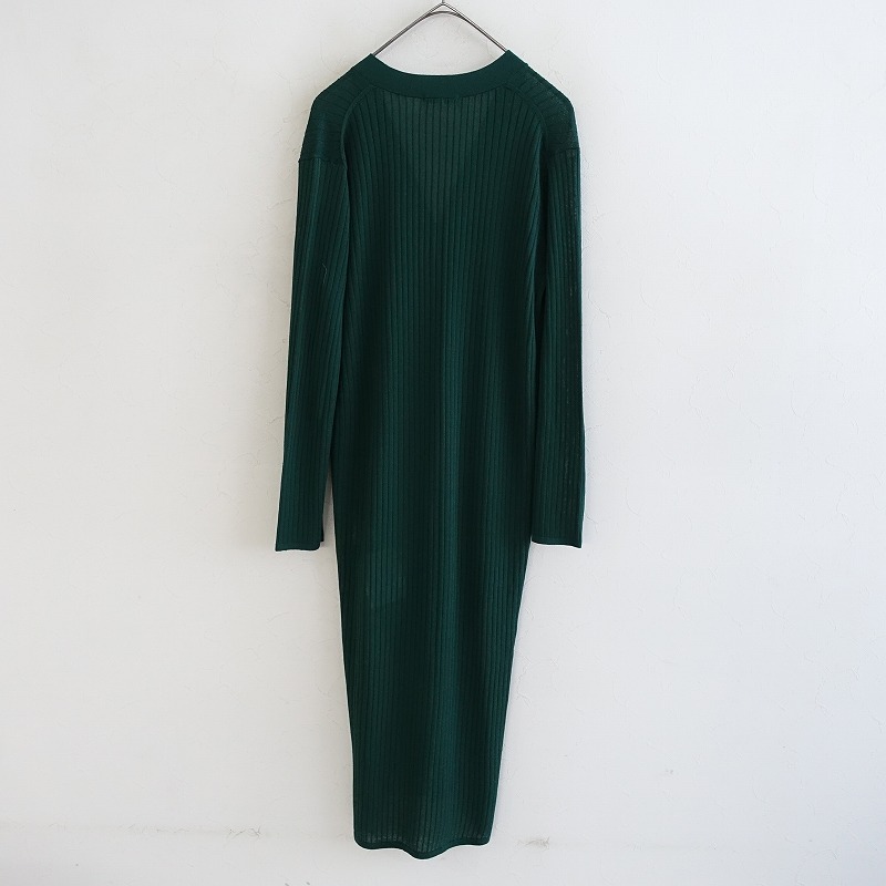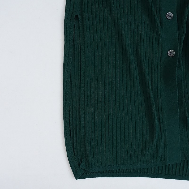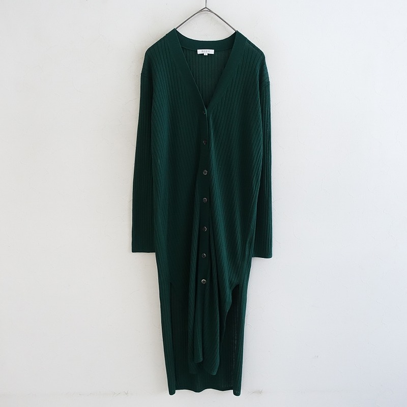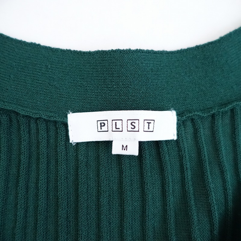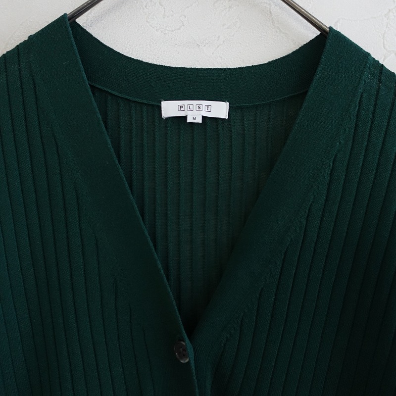 | PLSTのVネックロングカーディガンです。カラーはグリーンです。ポリエステル、コットン、リネンの細番手の糸でリブに編み立てられた、サラリとした肌触りの薄手ニットを使用。Vネックのロングカーディガンで、裾サイドはスリット入りです。ポケットはございません。 |