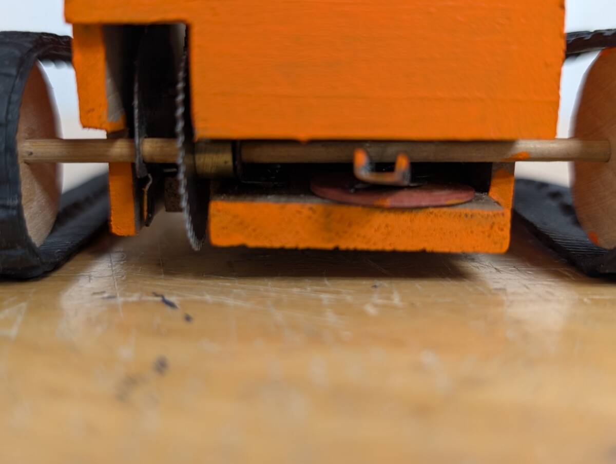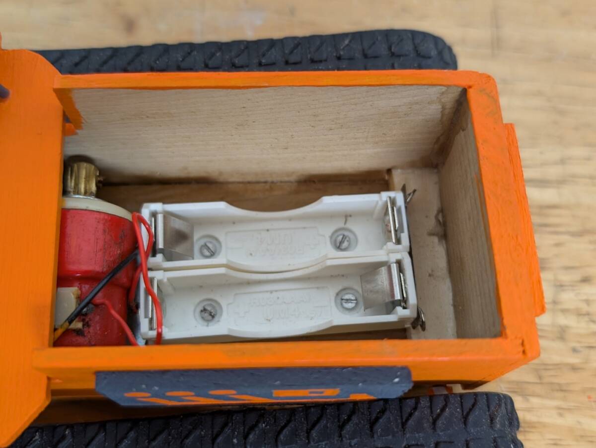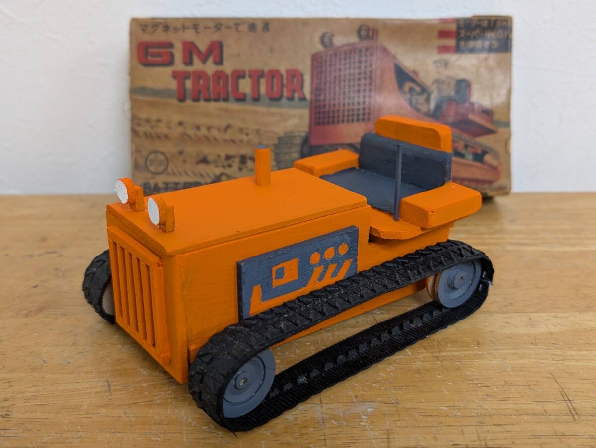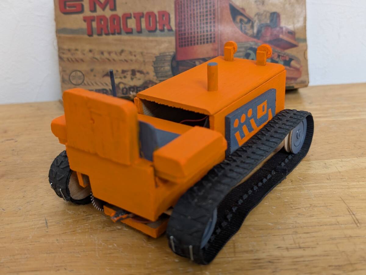 サンワ(約13.5cm)木製キット GMトラクター 組塗装済みです。箱はありません。取説欠品です。組塗装済みです。単4電池2本で動きます。ゴムキャタは別部品流用で瞬間接着剤とホチキス留めしてあります。ピニオンと後輪ギヤが動かしてる内に緩むのでギヤ脇の小ネジを隙間から締めることができます。70年近く前のプラモ以前の古い珍しいキットです。欠品があってもご容赦下さい。興味ある方いかがですか。