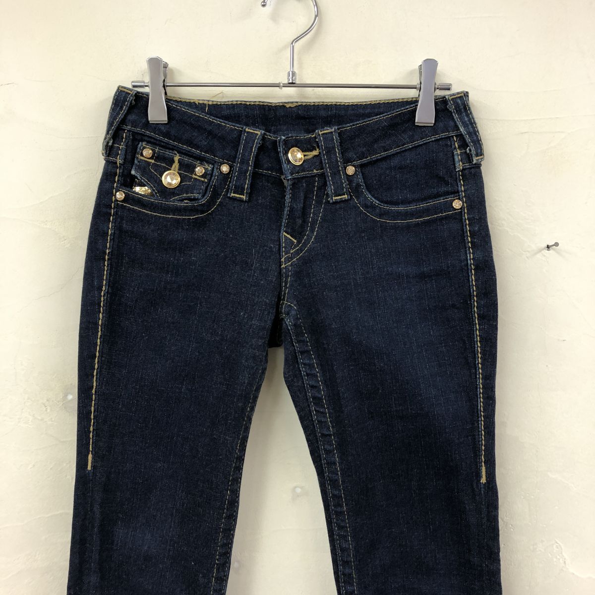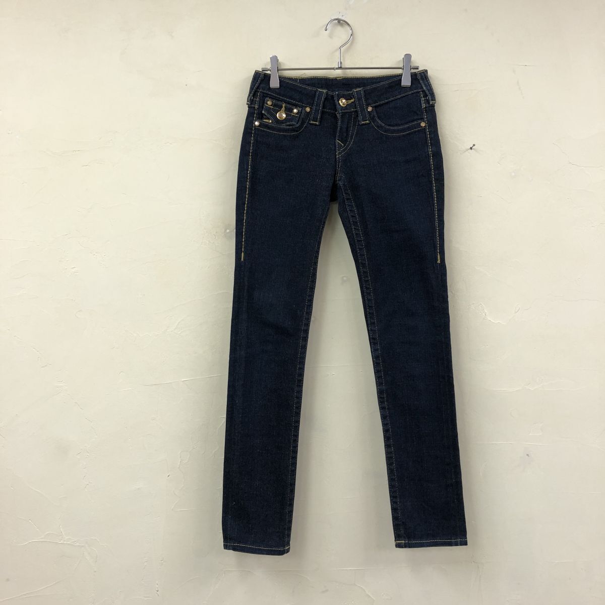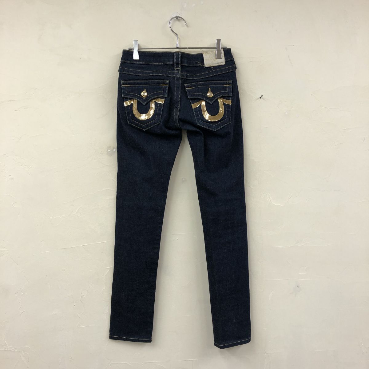 2H2108-G◆美品◆ TRUE RELIGION トゥルーレリジョン USA製 スキニーデニム ビジュー ストレッチ フラップ スパンコール ◆ size24 紺 綿