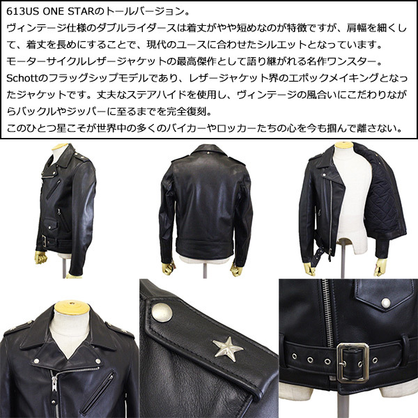 | スペック | Schott(ショット)の定番ダブルライダース#618を現代風且つヴィンテージテイストに変化させ、さらに着丈を長くしたのがこの#613USTです。 |