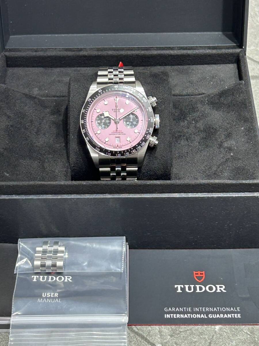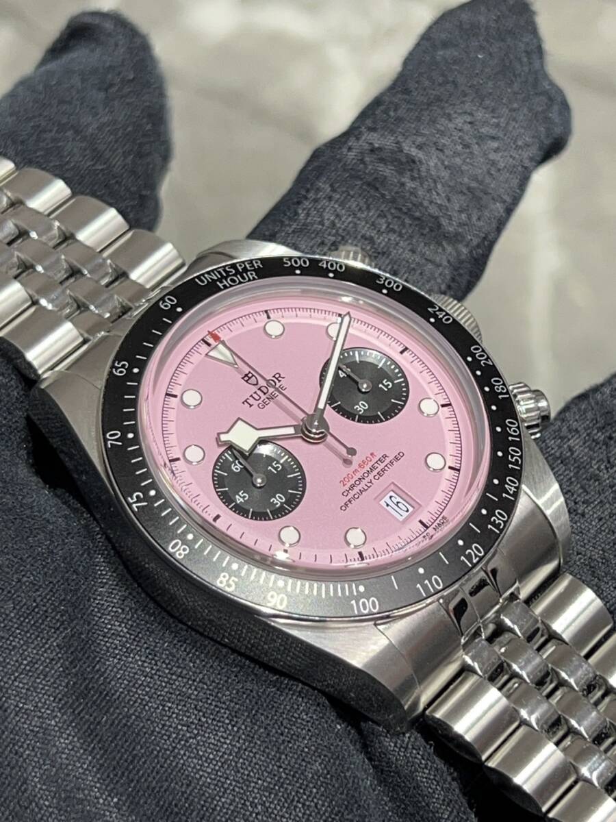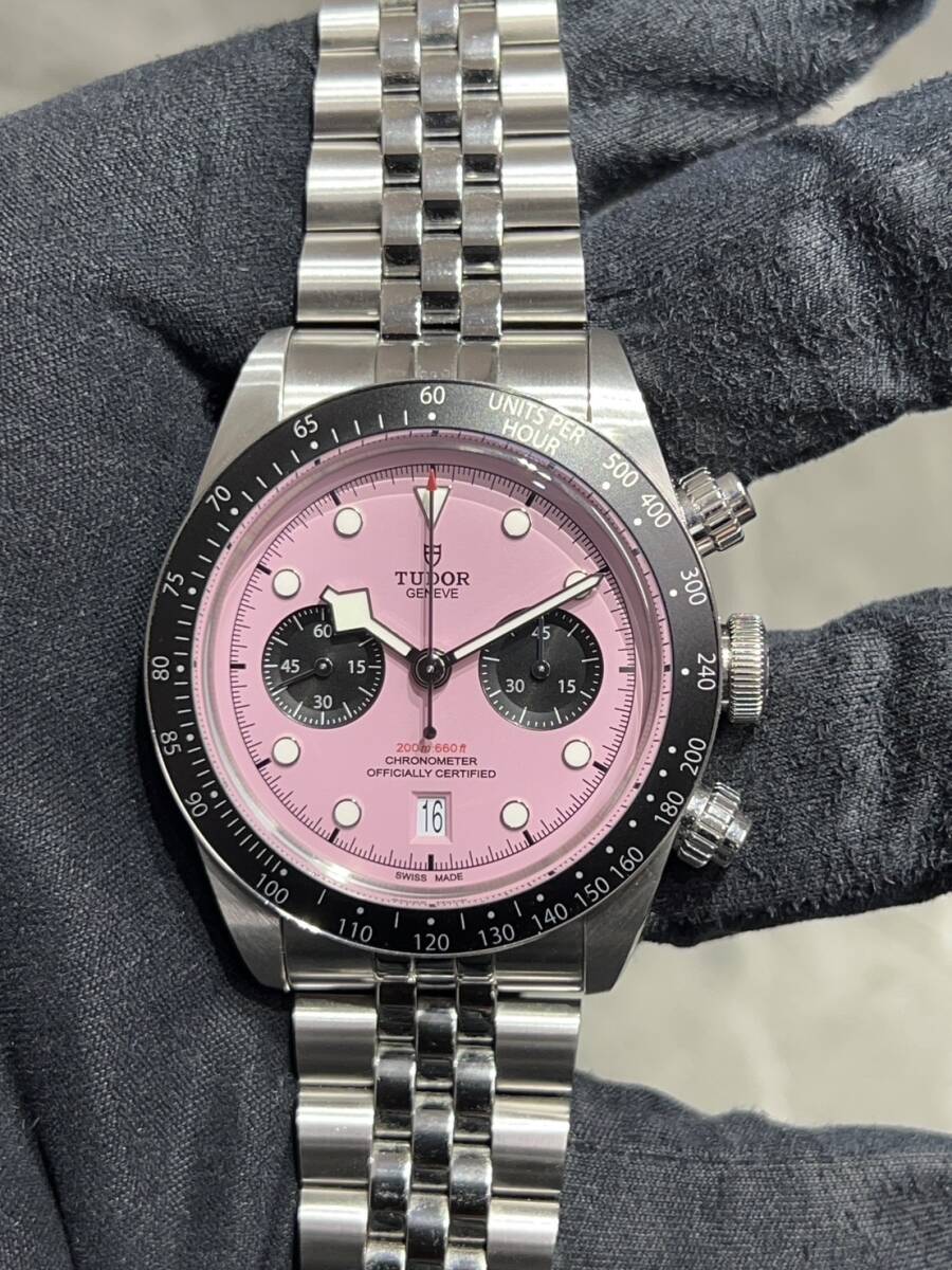 高い防水性とパワーリザーブをほこるチューダーの人気モデル、ブラックベイクロノ、ピンク文字盤が入荷致しました!