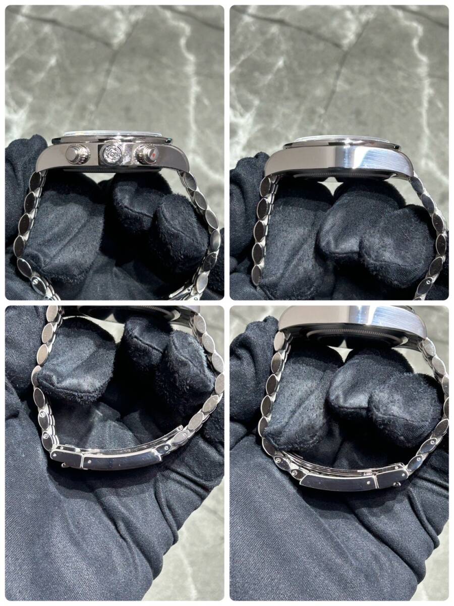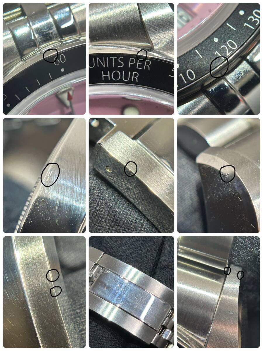 パッと見はとても綺麗な個体になりますが、12時、6時位置ベゼル、11時位置、1時位置ラグに極小の打痕があり、バックルやケースサイドにスレが確認できますが目立つ傷は少なく綺麗な中古品といった印象の個体です。最後の写真にて傷の写真をわかりやすく撮っておりますが実際はここまで目立ちませんので安心してご検討くださいませ。