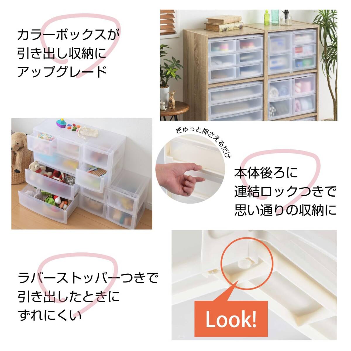 ふんわり包み込んで、どの部屋にも溶け込みやすいクリア。 文具や化粧品などの小物収納に。 各サイズ積み重ねてお使いいただけます。 前ズレを防止する脚ゴム付き おすすめの場所:キッチン・子供部屋・リビング・洗面所 おすすめの収納物:化粧品・メイク・おもちゃ・文具