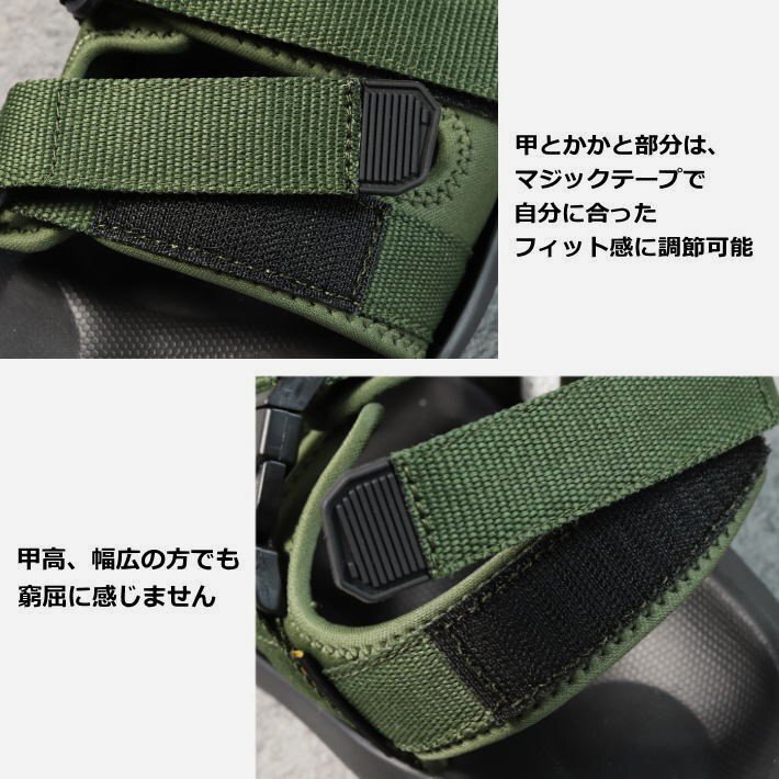 甲部分、かかと部分はマジックテープで、自分に合ったフィット感に調節可能。