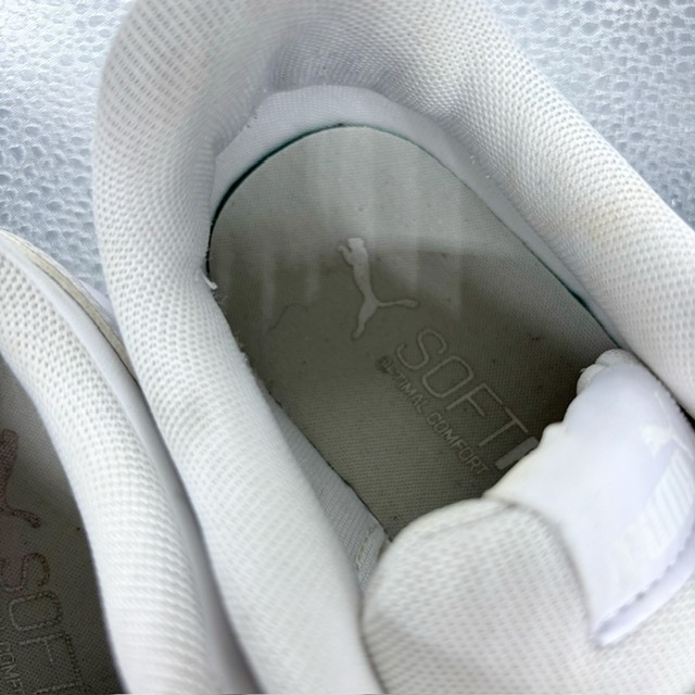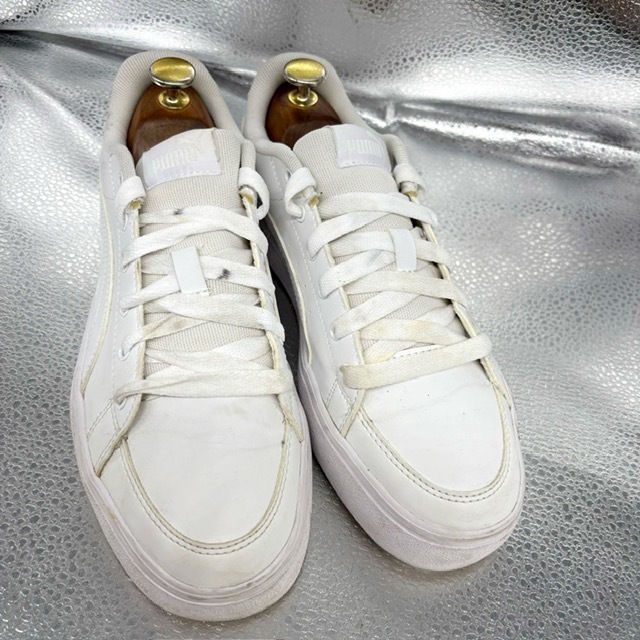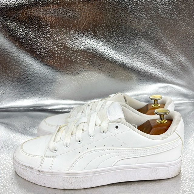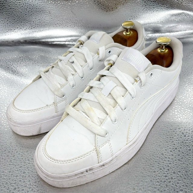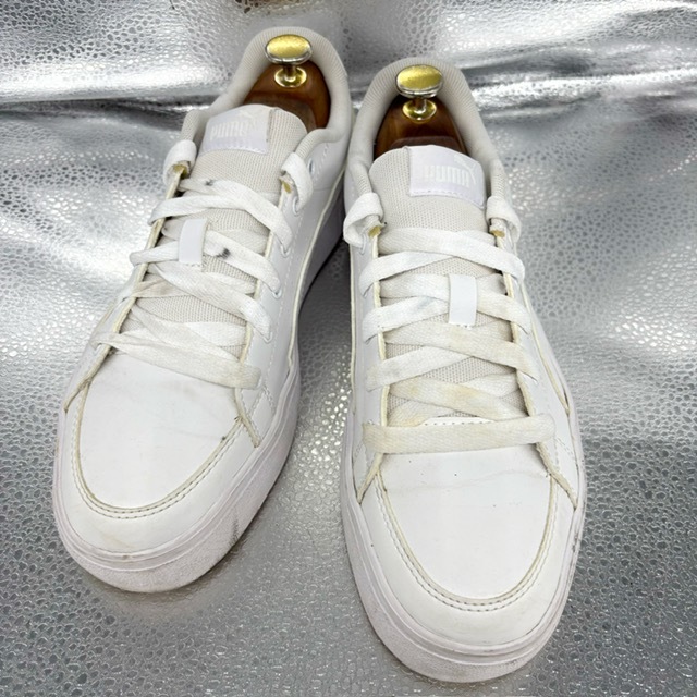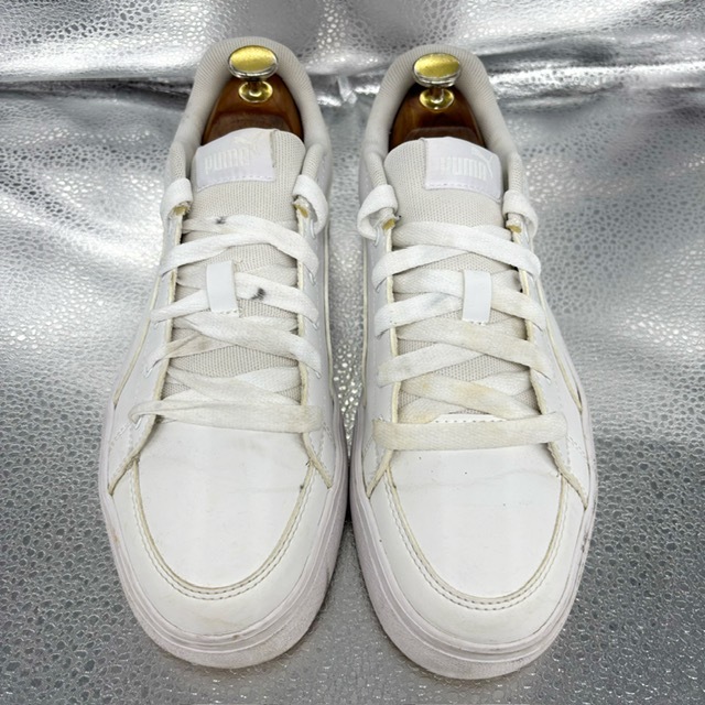 ご覧いただき、ありがとうございます。 オシャレで高級感のあるプーマ Pumaのスポーツシューズです。 デザイン性:機能性共に定評のある商品です。 1足押さえてあるとファッションの幅も広がり大活躍するお勧めの商品です。 中古品のため、スレや傷、ヨゴレ等ありますが、その分お値打ちにしております。詳しい状態は画像でご確認ください。 商品のサイズについて 表記サイズ 24.5cm アウトソール全長 約9.1cm 全幅 約9.8cm (素人採寸) ●状態①「外観」 履きジワ、着用に伴う擦れ、傷がございますが、着用に支障はございません。くわしくは画像で確認ください。 ●状態②「ソール・インナー」 インソール内ロゴ残っています。 ●その他・付属等なし、シューズキーパーは撮影用です。 | |||