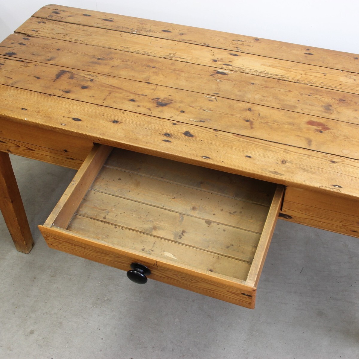 | コンディション condition | 天板の溝などの取り切れない汚れやキズ、穴などがあります。 また、OLDパイン材特有の虫食い跡がありますが、現在の虫食いはありません。 がたつきもなく、引き出しの滑りも問題ありません。 詳細は画像をご覧ください。 |