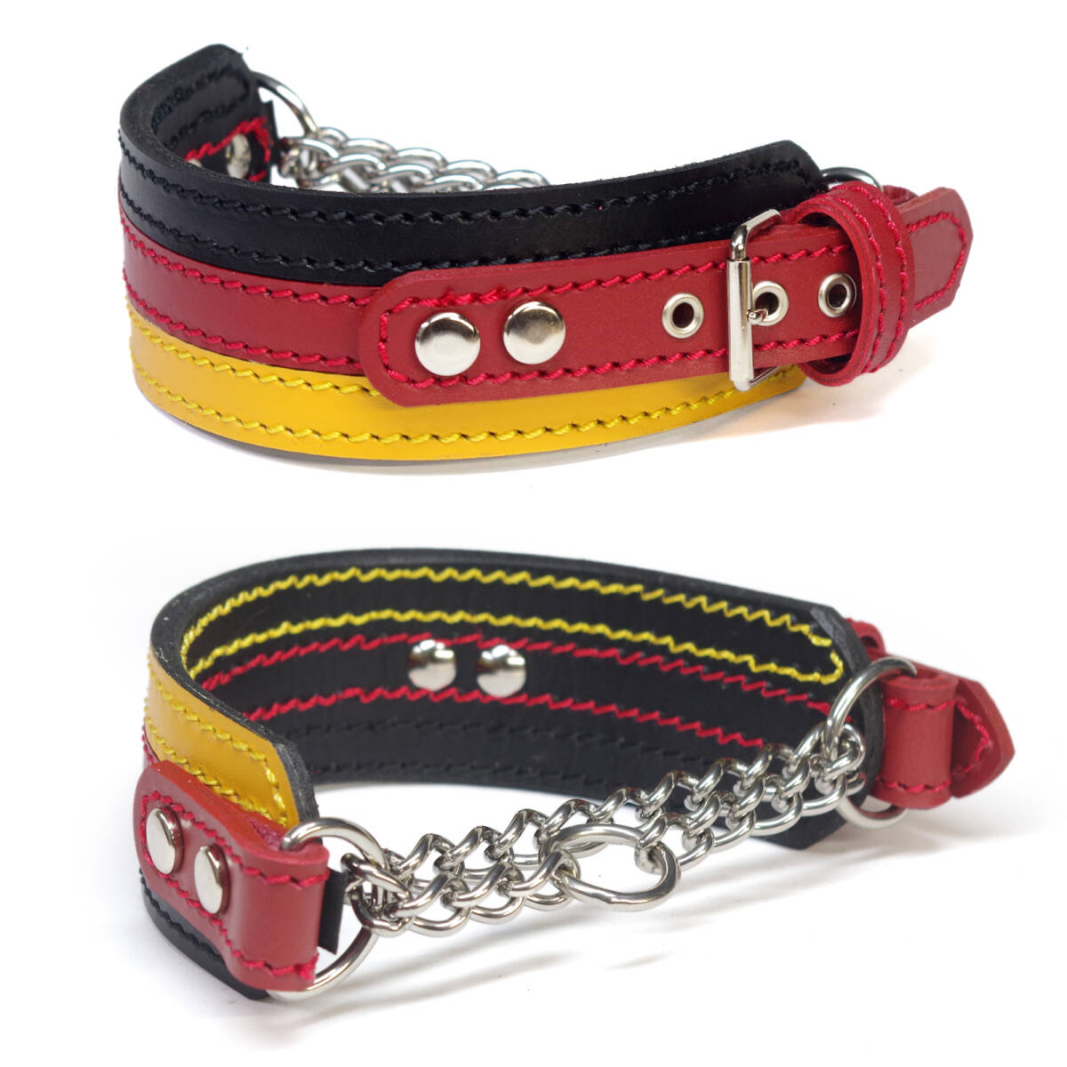 ウィペット系の首の長い子ようの4cm幅のハーフチョークです。少し調節できますが必ずきちんと測ってハーフチョーク使っている人は下記の革部分サイズ、鎖部分サイズを現在しているサイズと比べてみてから購入してください