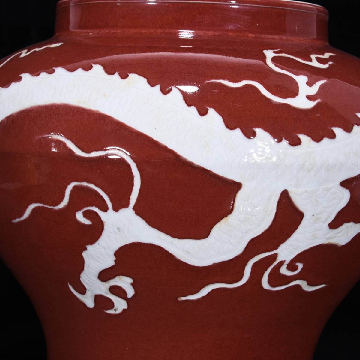 8:6489FL 人間国宝 中国骨董 磁器【元霽紅余白刻竜紋壺】工芸品 施釉陶 青花磁 陶芸 置物 收藏品