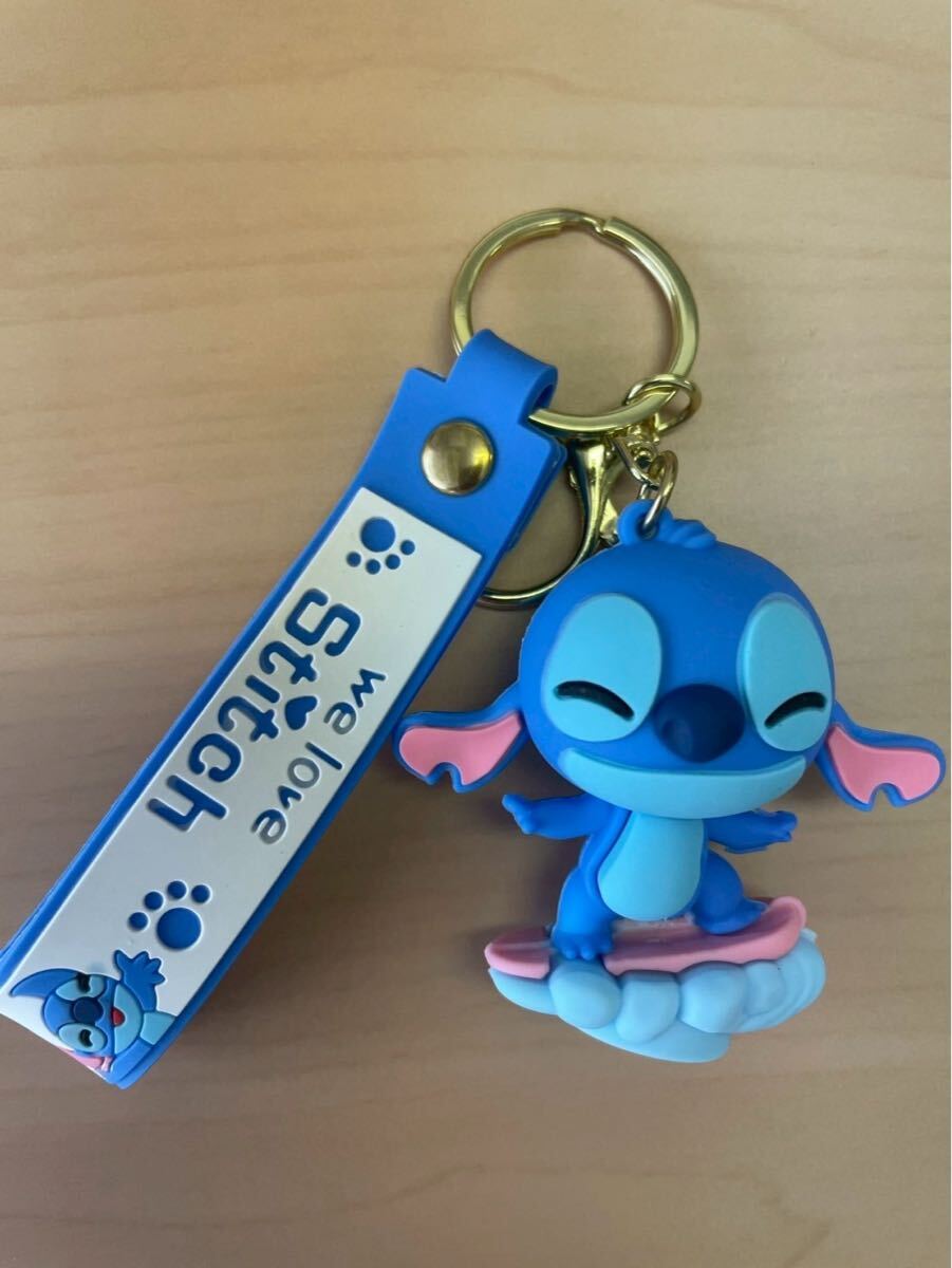 スティッチのフィギュア型キーホルダー、青とピンクの配色が特徴。