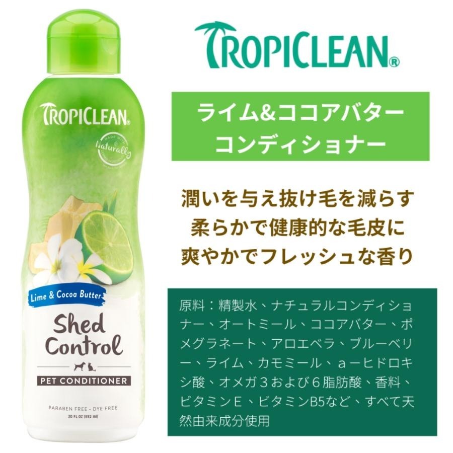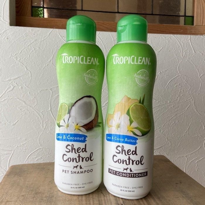 脂肪酸「オメガ6」「オメガ3」配合で肌に栄養を与え、洗い流す際に多くのアンダーコートを洗い流してくれるので抜け毛が減り、もつれを取り除くとされています。ライムとココアバターは犬猫達の被毛に自然な水分バランスを補給してくれ、滑らかに仕上がります。ライムの爽やかな香りも感じます。同じく抜け毛を抑えてくれる「ライム&ココナッツシャンプー」もございます。