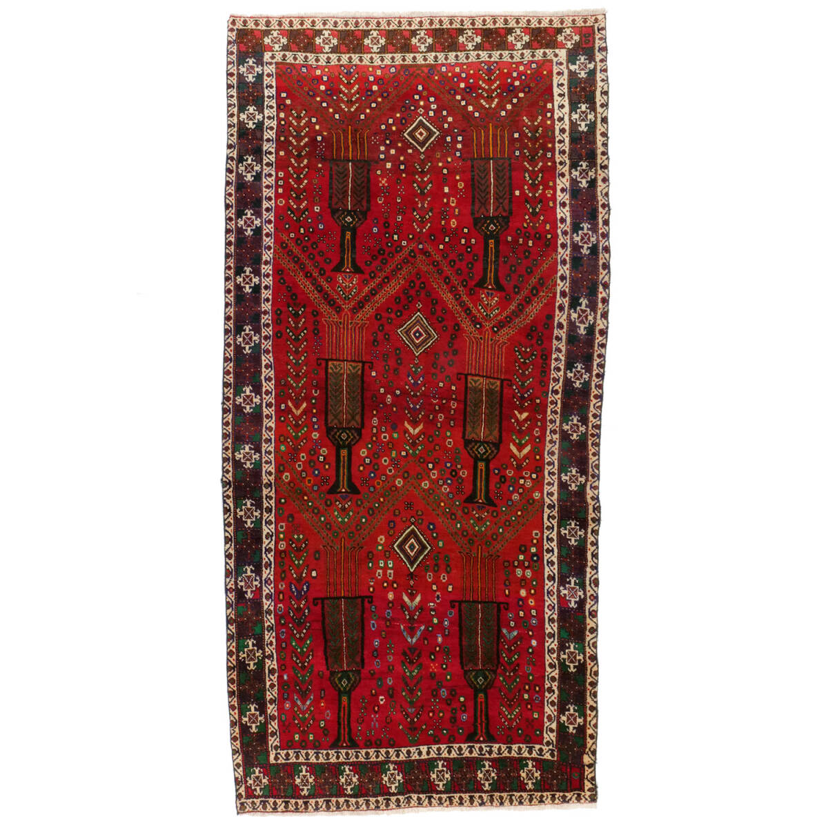 1970年代、イラン東部ザーボルで織られた大判のセミアンティークラグです。フィールド全体に堂々と並ぶ「ミナレット文様」は、伝統的な建築意匠を思わせる整然とした構図で、空間に安定感と荘厳さを与えます。