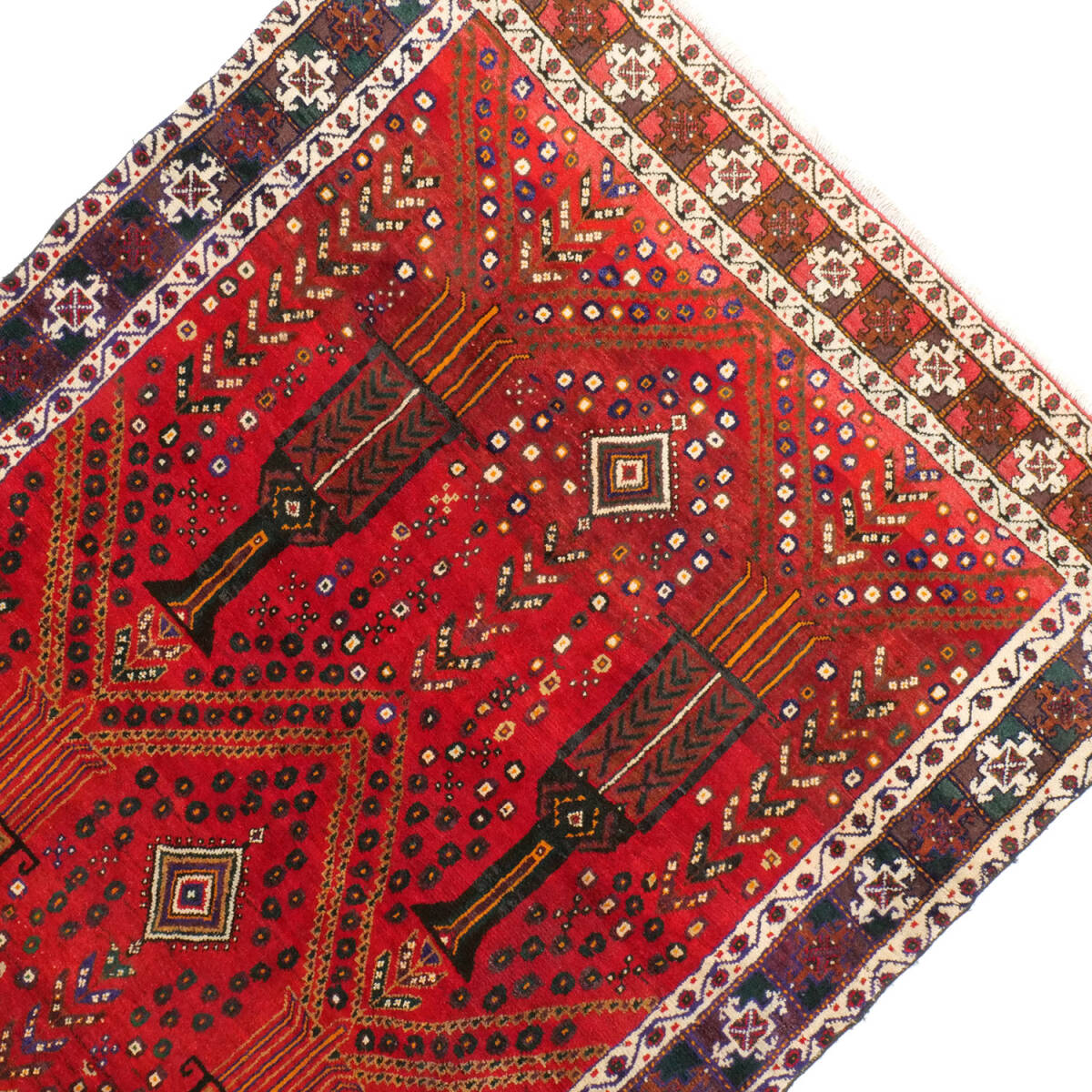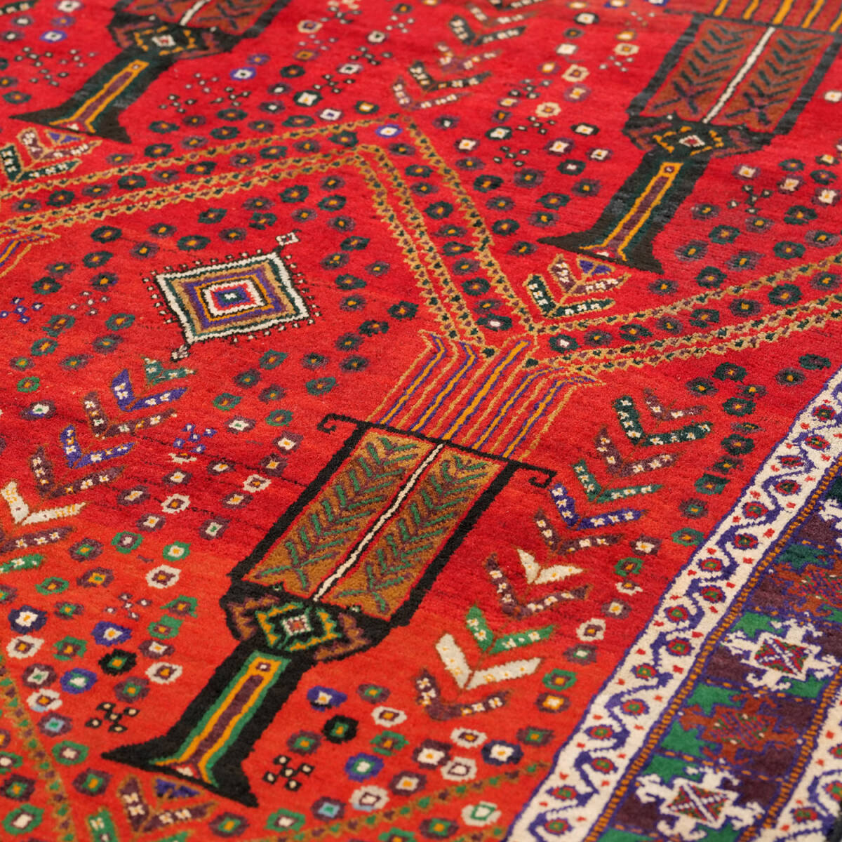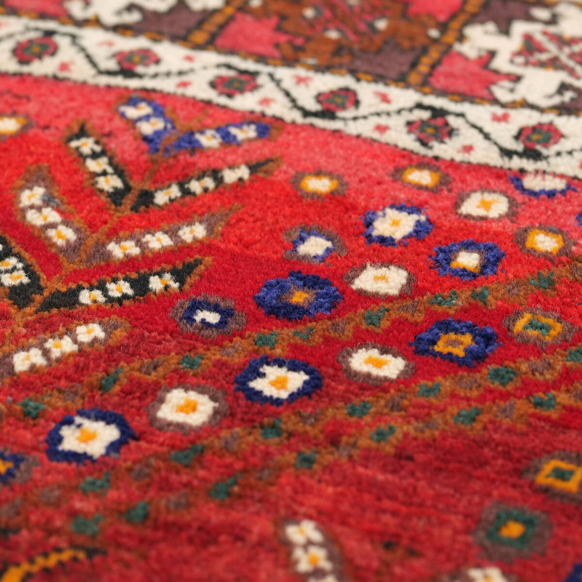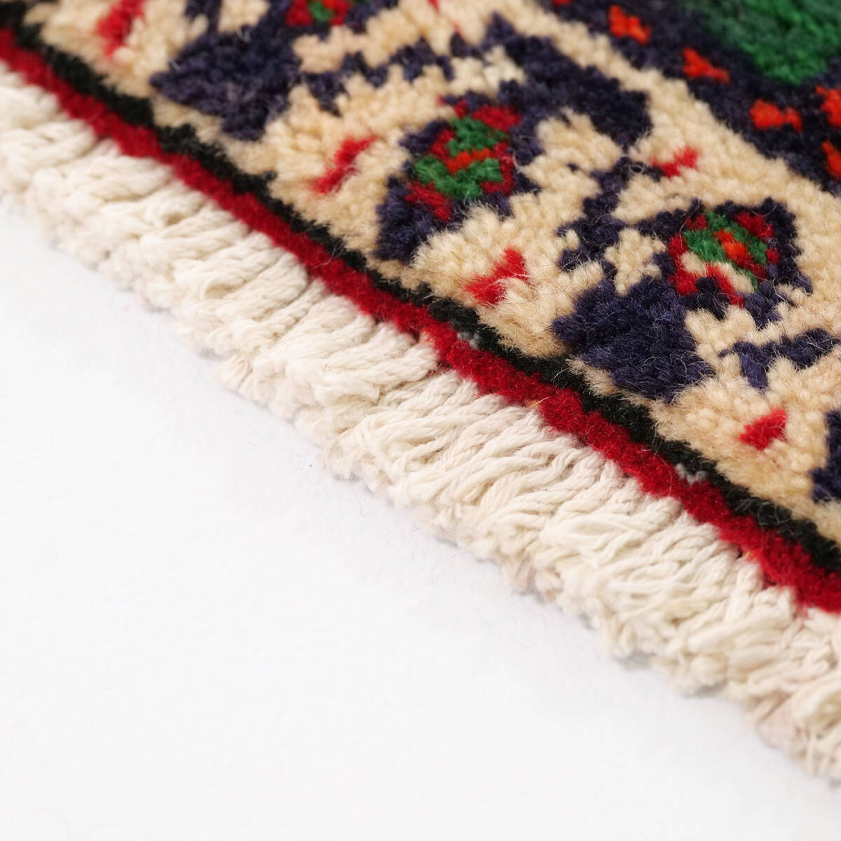 深紅を基調とした地色に、黒・生成り・緑・黄を重ねた配色は、力強さと華やかさを兼ね備えたバランス。特に広いリビングやダイニングの中央に敷けば、部屋全体の印象を引き締め、視線を集める主役的存在となります。