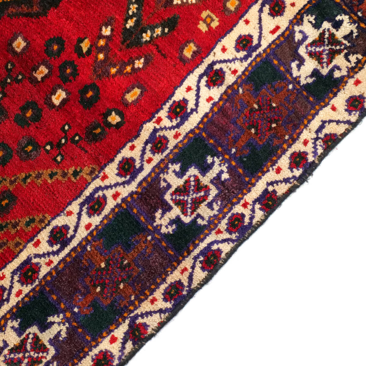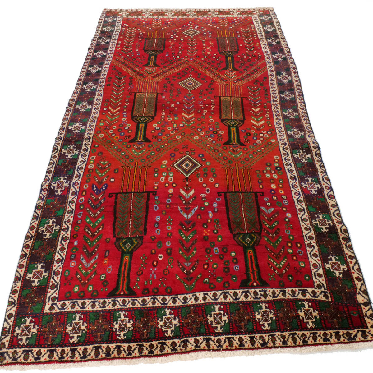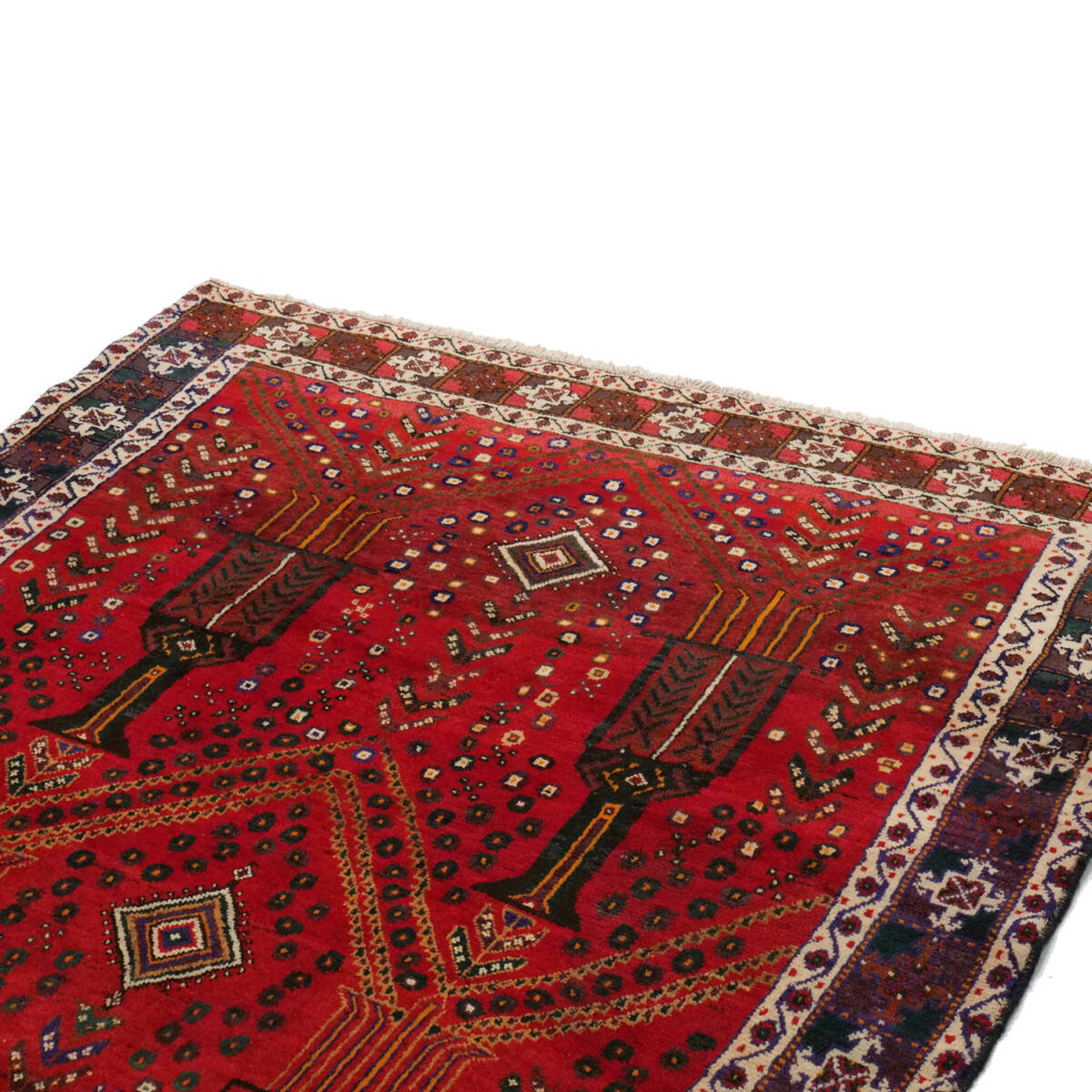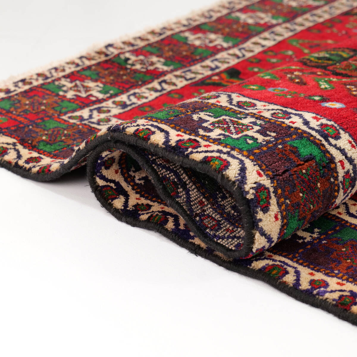 深紅を基調とした地色に、黒・生成り・緑・黄を重ねた配色は、力強さと華やかさを兼ね備えたバランス。特に広いリビングやダイニングの中央に敷けば、部屋全体の印象を引き締め、視線を集める主役的存在となります。
