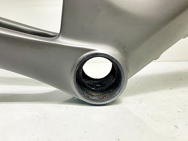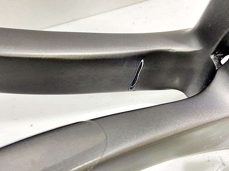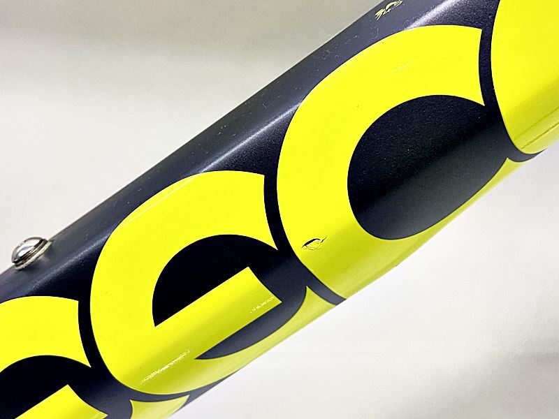 ダウンチューブのデカール部分にキズ、塗装のひび割れがあります。