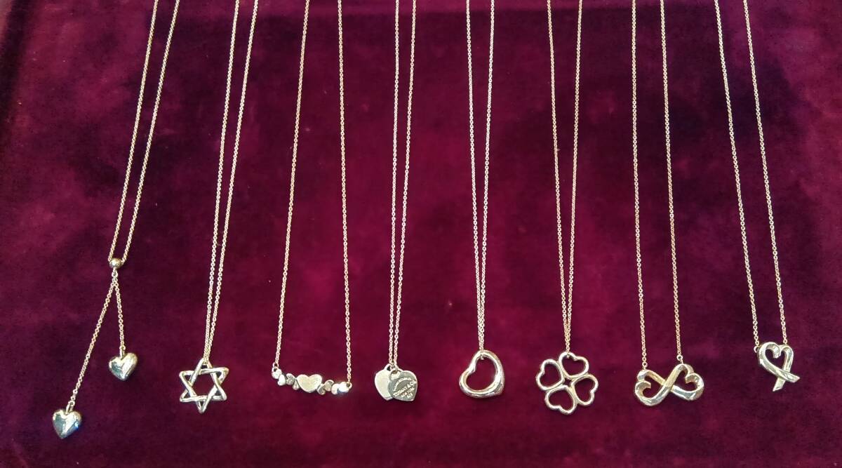 TIFFANY&Co. SV925 ネックレス 8種 全て未使用で一度も着けた事はないのですが保存時にできた小傷等はあります。 (ジュエリーケースにそのまま裸で収納してましたので・・・) SV925ですのでシルバークリーナー等でキレイになると思います。 ・スターオブダビデ ・オープンハート ・ラビングハート ・ダブルラビングハート ・クローバーハート ・ダブルドロップハート ・モダンハート ・リターントゥ ダブルハート かなり昔に購入した商品なので入手困難な物もあると思います。 付属品ナシ (ポーチ1つだけお付けします) | |||