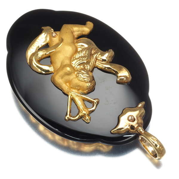 卓越した技術から芸術性豊かなジュエリーの数々を生み出す王室御用達ジュエラー カレライカレラの逸品。艶やかでインパクトあるオニキスの輝きにアダム&イヴとエンジェルモチーフをリバーシブルに飾ったジュエリーです。 |