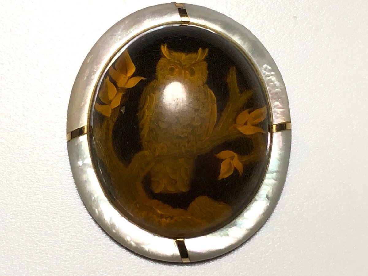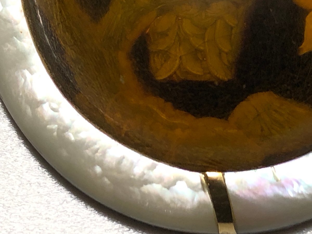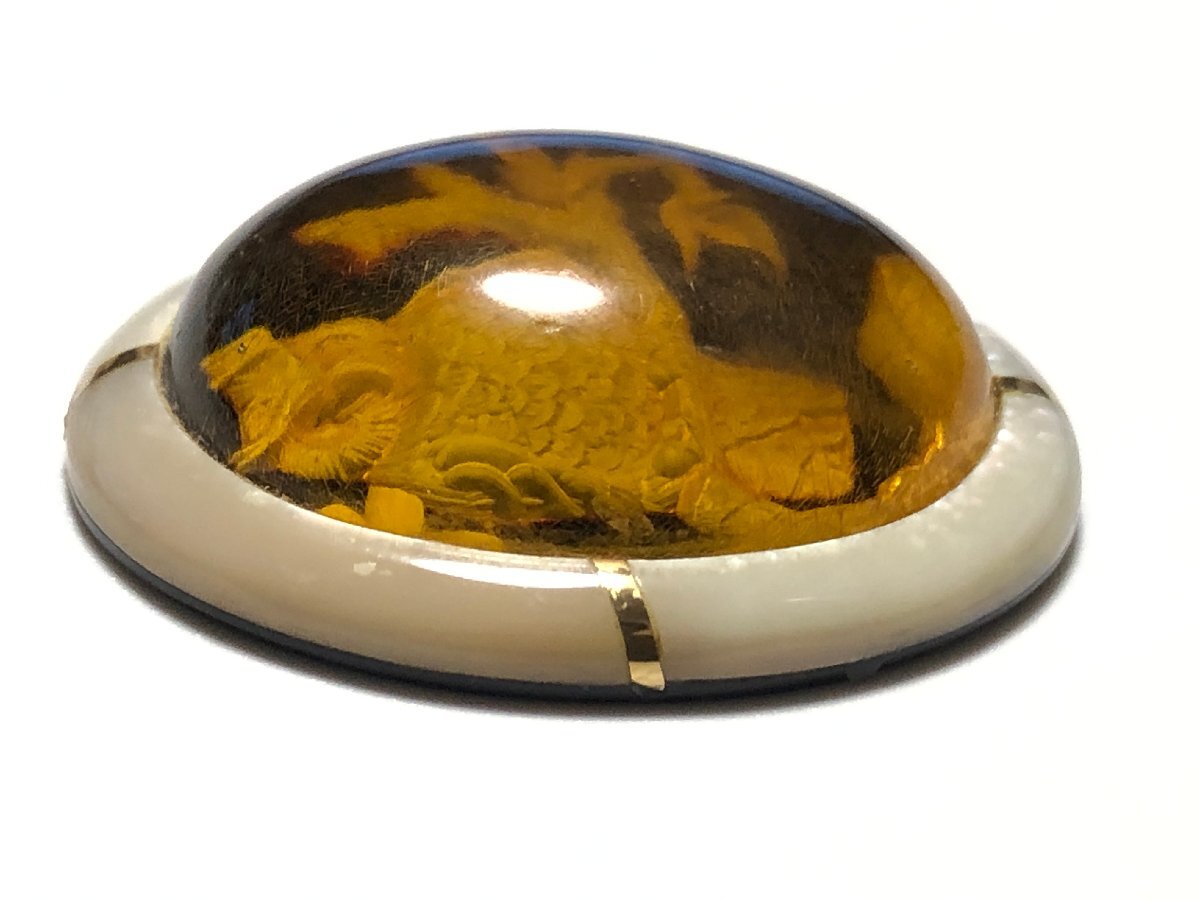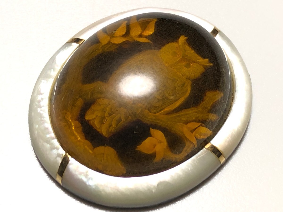アンティークの本琥珀、白蝶貝、本鼈甲、K18を使用し、インタリオ(沈み彫り)でミミズク細工を施した、カメオのルースです。作者の刻印があります。K18はライン部分のみ使用ですが、刻印はありません。状態良好です。