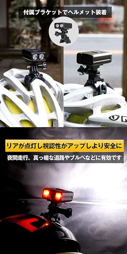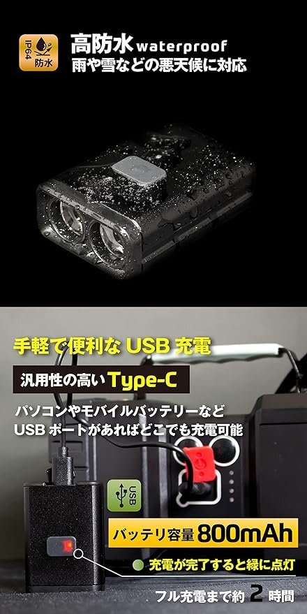 前も後ろも点灯! フロントライトとして、付属のブラケットを使えばヘルメットライトとしてそしてリアも光るライト。 様々な使い方ができる2wayサイクルライトです。 装着も簡単、工具不要でお使い頂けます。 USB充電は汎用性の高いタイプCを採用しています。 また高防水性があり雨や雪の中でも対応。 フロントライトとしてまた夜間のヘッドライトとして実用的なサイクルライト。 通勤や通学から夜の走行やトンネル内、ブルペなどに。 ロードバイクやクロスバイク、マウンテンバイク、ミニベロなど様々な車種の自転車に最適。 [前も後ろも点灯] フロントとリアが点灯するので状況に応じて利用できる。 また前後両方点灯させる事が可能。 [ヘルメットに装着] 付属のブラケットを使えばヘルメットに装着する事が可能です。 ヘルメットに装着してヘッドライトとして、そして後方に存在を示すリアライトとして使用できる。 より安全な夜間走行が期待されます。 (※ヘルメットの形状によって使えない場合もあります) [高防水] 天気に左右されずにタフに使える。 雨や雪の中でも気にせずに走行が可能。 [USB充電式] 手軽で便利なUSB充電。 パソコンやモバイルバッテリーなどから充電可能で人気。 また汎用性が高いタイプCを採用。 [明るくかわいいデザイン] コンパクトなデザインで邪魔にならずハンドルに装着してもスッキリと収まります。 小さいのに明るく頑丈で頼りがいのあるライトです。 [アルミ合金+PC] ライトシェルは工業用高強度アルミ合金とPC構造によって作られ、高い耐久性と信頼性があります。 [装着簡単] 工具要らずでブラケットの装着が可能。 またライトだけ取外しができるのでライトの盗難防止にも。 ジャンク品のためキズ、汚れ、一部割れや破損等ある場合がございます。 正常に動作しない場合や修理が必要な場合がございます。 パーツや付属品が足りない場合がございます。 ノークレーム、ノーリターン | |
