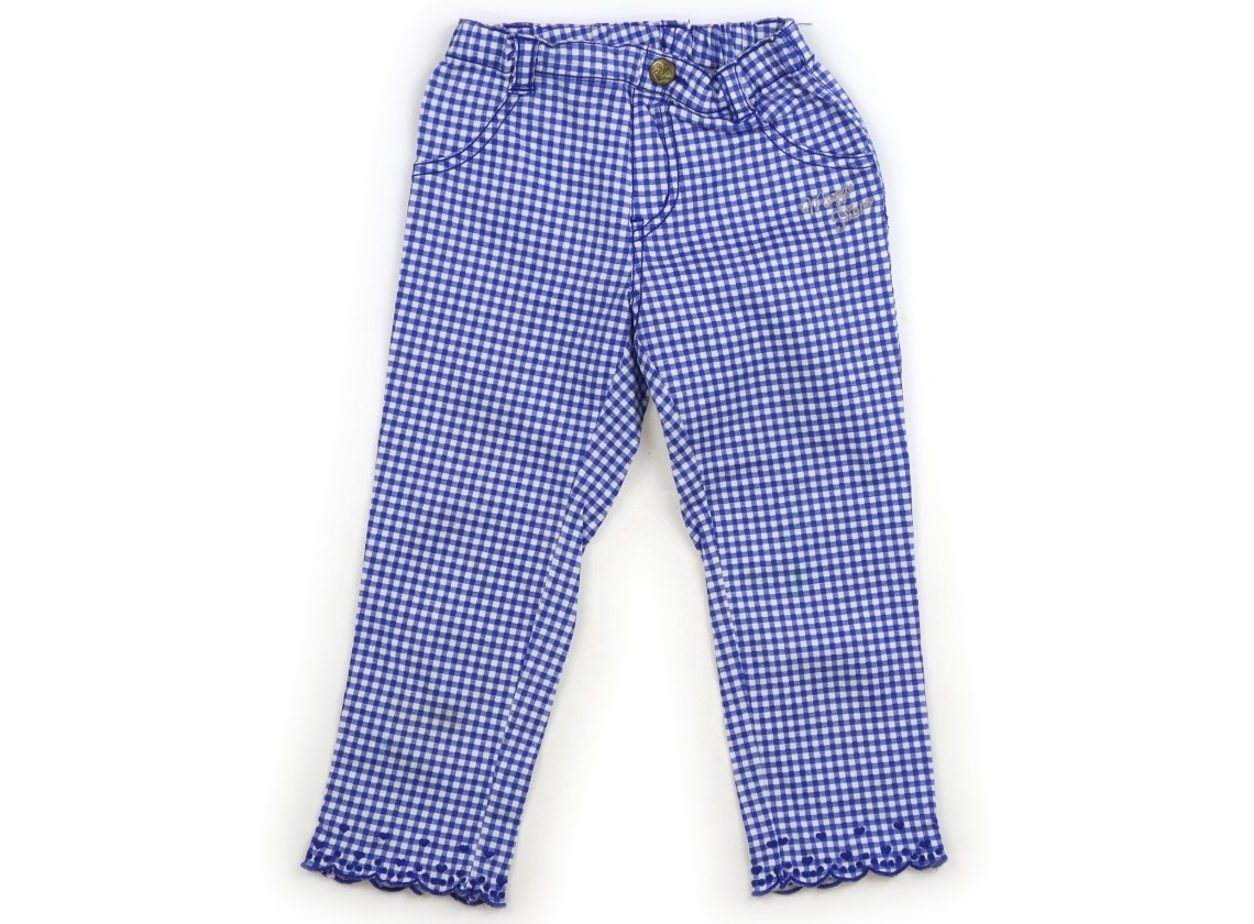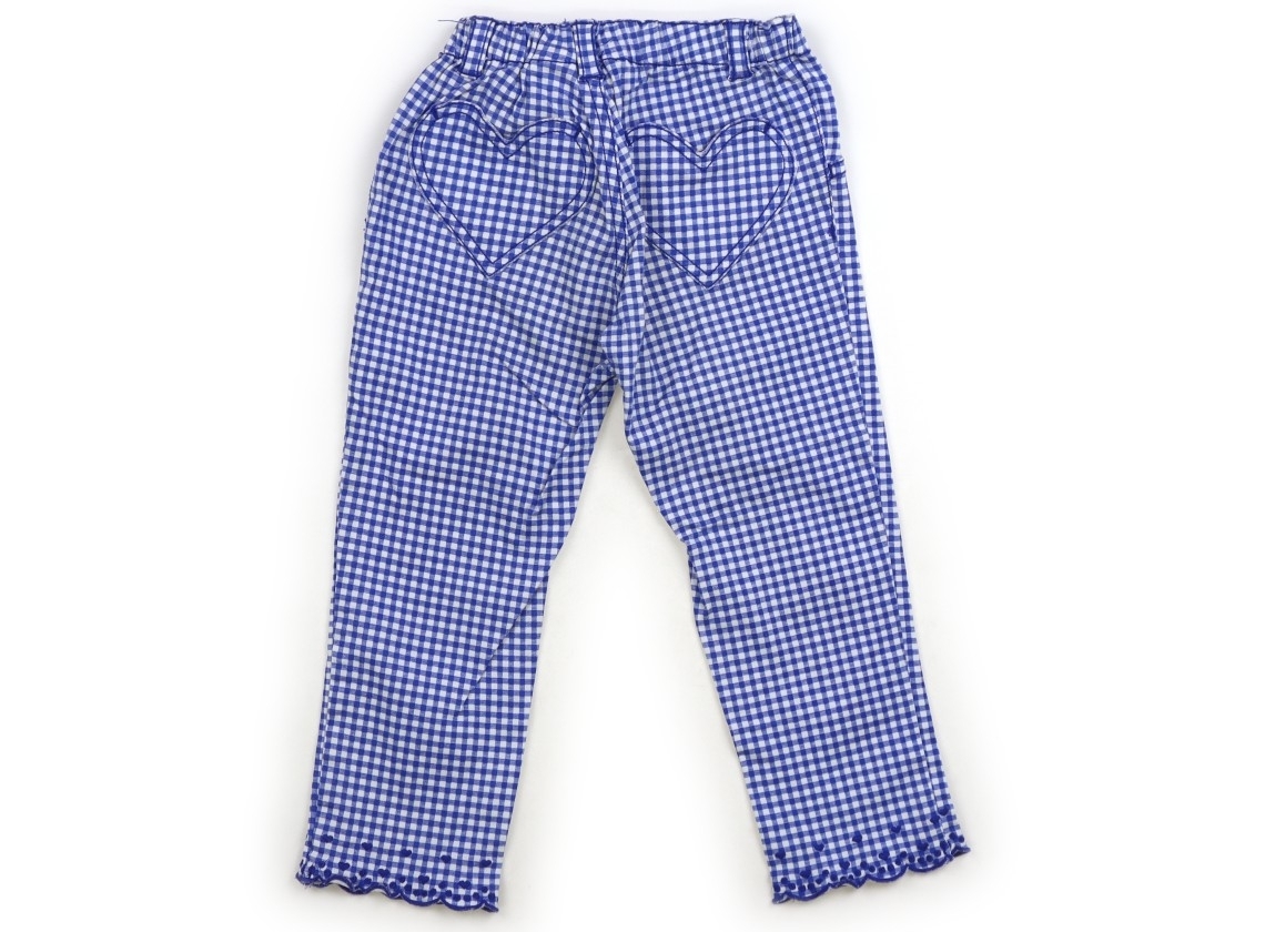 レーヨン配合の柔らかいストレッチ生地、サイズ調整ゴムが付いています。七分丈です。お尻に少し色褪せ、膝周りにインク汚れがあります。
