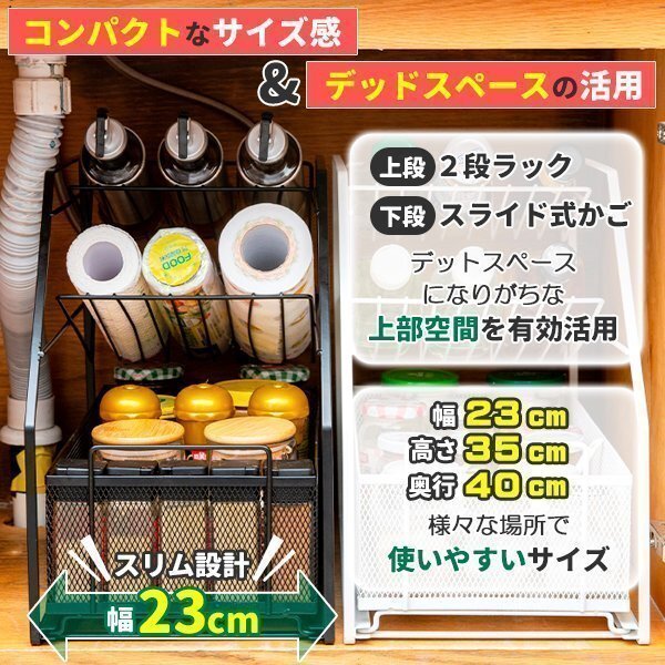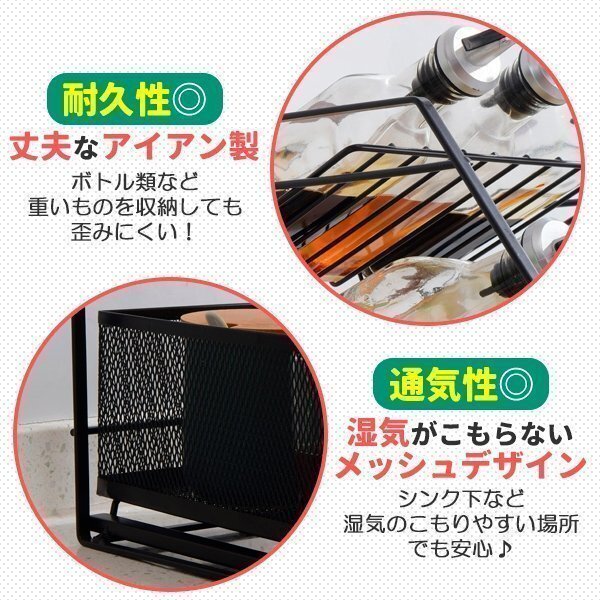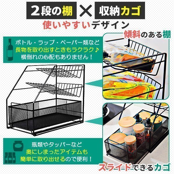 キッチン シンク下 収納 スライド 引き出し 2段 洗面台下 ラック 折りたたみ スリム ブラック 黒 引き出し ボトルラック スパイスラック