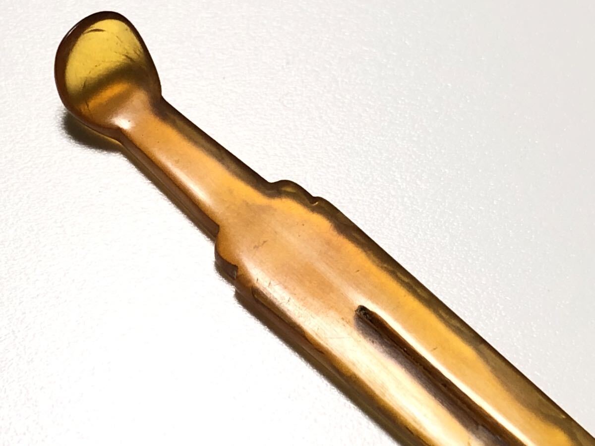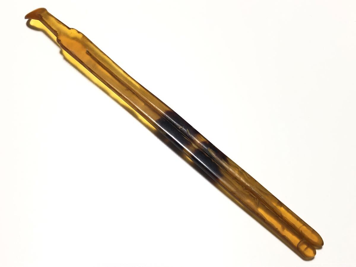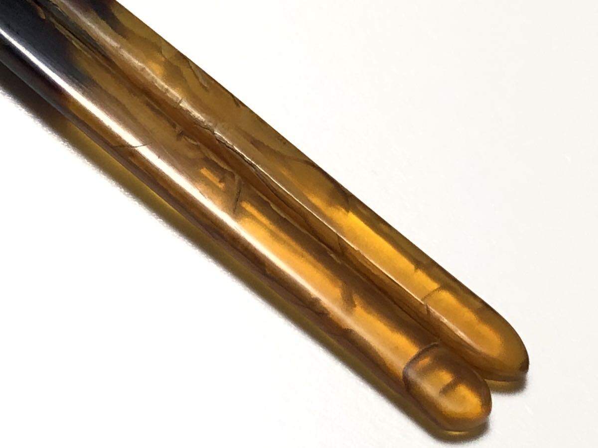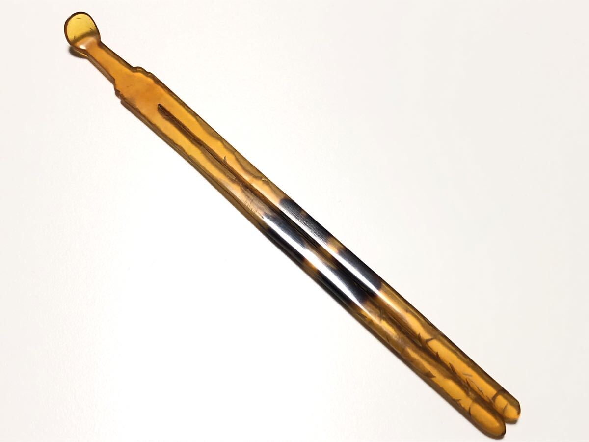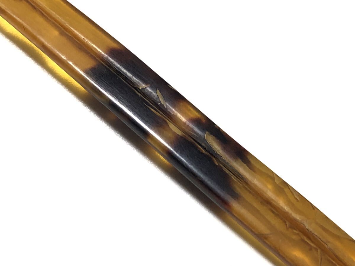 アンティークの白甲・黒甲の本鼈甲を使用した簪です。経年により、鼈甲の張り合わせ部分が浮き出ています。鼈甲部分に欠けや虫食いはありません。