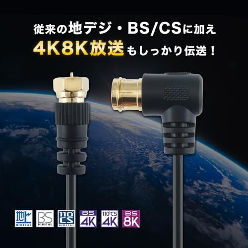 新4K8K衛星放送対応 従来の地デジ、BS、CS放送に加えて、最新の4K/8K放送にも対応しています。 しなやかな2.5Cケーブル採用 2.5Cケーブルは、4Cケーブルに比べ細く、取り回し易いので配線が簡単に行えます。 配線しやすいL字差込式/しっかり接続ネジ式コネクタ L字差込式コネクタは、狭い隙間にあるアンテナコンセントへの接続に最適です。機器にはもう一方のネジ式コネクタでしっかりと接続ができます。 信号が劣化しにくい両端子金メッキ仕様