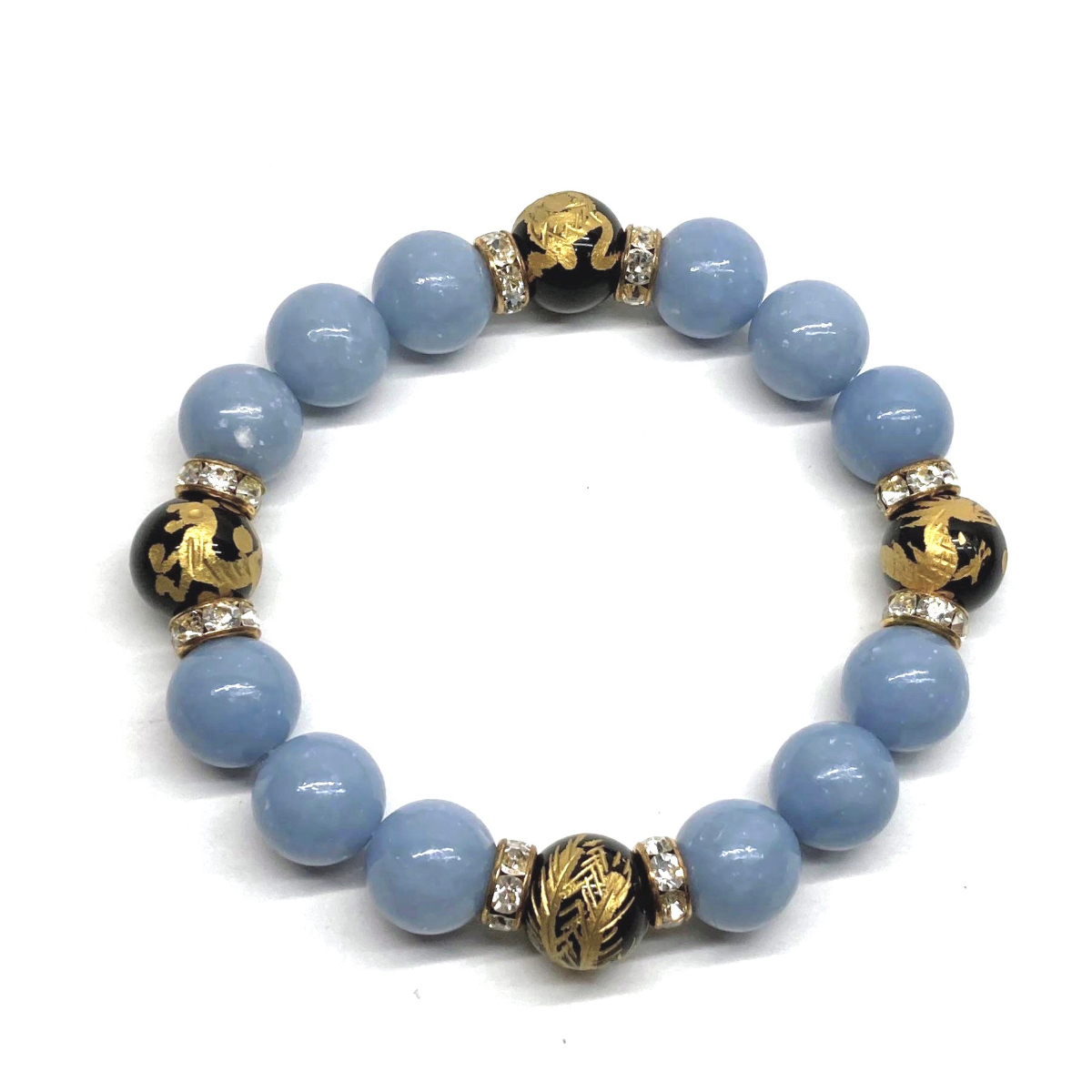 こちらは、四神獣金彫オニキとエンジェライトを組み合わせたパワーストーンブレスレットです。四神獣は、中国の伝説で4つの方向(東西南北)を守護する神聖な神。四神獣、厄災から身を守り、多くの運気を呼び込むと言われております。石大きさは程よくインパクトのある12mm玉で内周 約17cmです。 数に限りがございますので気になる方はお早めにどうぞ。