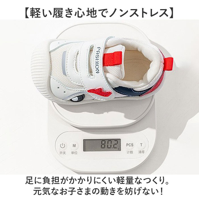 | 商品説明 | ・・【歩き始めの赤ちゃんに♪】 ・よちよち歩きの赤ちゃんにオススメなベビーシューズが新発売。 ・【軽い履き心地でノンストレス】 ・足に負担がかかりにくい軽量なつくり。元気なお子さまの動きを妨げない! ・【面ファスナーで着脱カンタン】 ・自分サイズに微調整できる、面ファスナー式。かかとにはプルタブ付きで、足入れがスムーズ。 ・【程よいクッション性のインソール】 ・柔らかインソールが足裏にかかる衝撃をガードし、疲れを軽減。取り外しもOK。 ・【屈曲性があり、歩きやすさUP】 ・つま先部分は、足の動きに合わせて柔軟に曲がる上向き形状。蹴り上げやすくつまずきにくい! ・【滑りにくく安定感のあるソール】 ・アウトソールはラバー素材に凹凸加工を施し、滑りにくく安定した歩行をサポート。 ・【兄弟・姉妹で可愛くお揃いに】 ・男の子も女の子も履きやすいくすみカラーをラインナップ。可愛いアニマルフェイスデザイン。 |