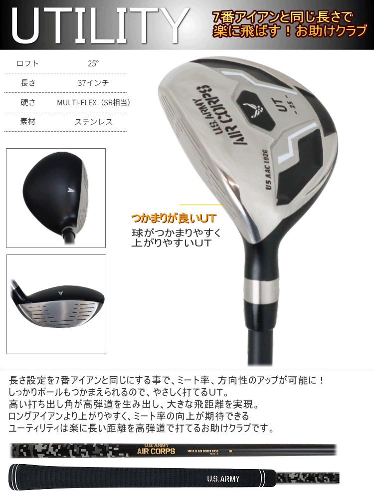 【商品特徴】 <US ARMY AIR CORPSのレフティセットが新登場> 日本でも根強いファンを持つ、アーミーシリーズ。AIR CORPS空軍をモチーフにしたクラブセットとなります。 デザインだけではなく、機能性にもこだわった一品です。 ユーティリティとロングアイアンを7番アイアンと同じ長さにするセミレングスを採用。 一般的に長いクラブは難しく感じてしまい、苦手な方が多いですが、セミレングスにすることで、7番アイアンと同じような感覚でスイングでき、 よりやさしく飛ばすことができます。 ビギナーから、久しぶりにゴルフを再開される方など、満足していただける仕上がりになっております。 【商品詳細】 ●状態:新品・未使用品 ●レフティーモデル(左用・左打ち用) ●セット内容:1W、UT、6I、7I、8I、9I、PW、SW、PT(9本セット)、ヘッドカバー3点(1W用,UT用,PT用) ●シャフト:1W、UT/オリジナルカーボンシャフト 6I、7I、8I、9I、PW、SW、PT/オリジナルスチールシャフト ●シャフトフレックス:R(ドライバーのみ選択可能) ※ユーティリティは、マルチフレックス ※アイアンは、SR相当となります。 ●グリップ:オリジナルグリップ ※ゴルフクラブのセットとなり、キャディバッグは付属しません。 ※撮影時の光量の具合や、ご覧いただいております画面環境によりまして、実際の商品と若干色味が違う場合がございます。 ※商品詳細のスペック値はメーカー表記の数値となりますが、個体差による若干の公差がございます。