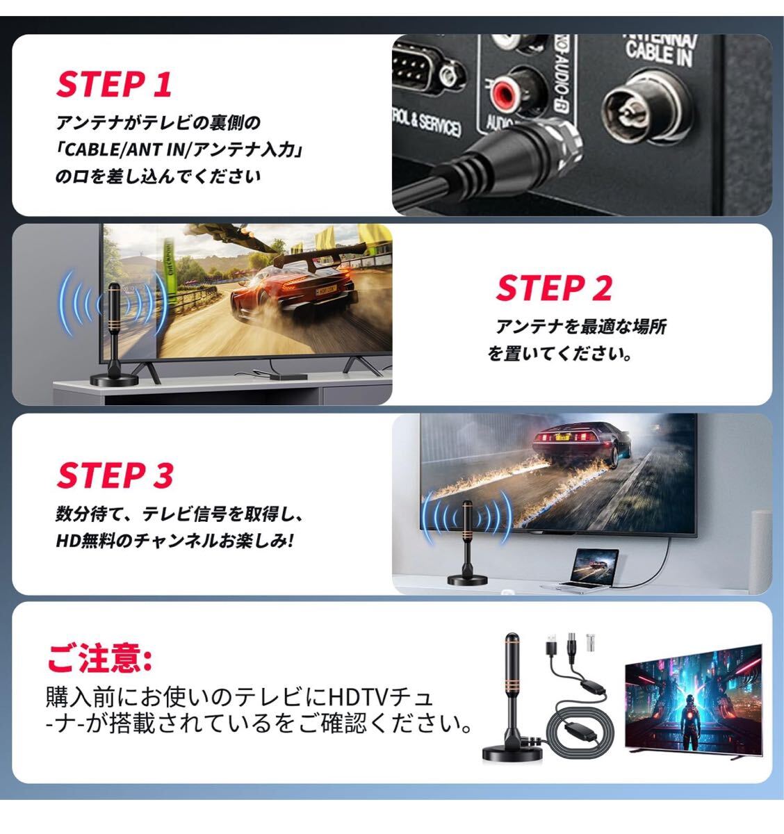 「簡単設置」HDTVへの接続が簡単。プラグを差し込み、設置して、テレビアンテナをHDTVの背面に接続し、メニュー→チャンネルスキャンで簡単に番組を検索できます。同軸ケーブル付属で、室内のどこにでも設置可能。つまり、設置→接続→チャンネル検索の3ステップで完了!設置が非常に簡単なため、以前のように専門業者を呼ぶ必要はもうありません。