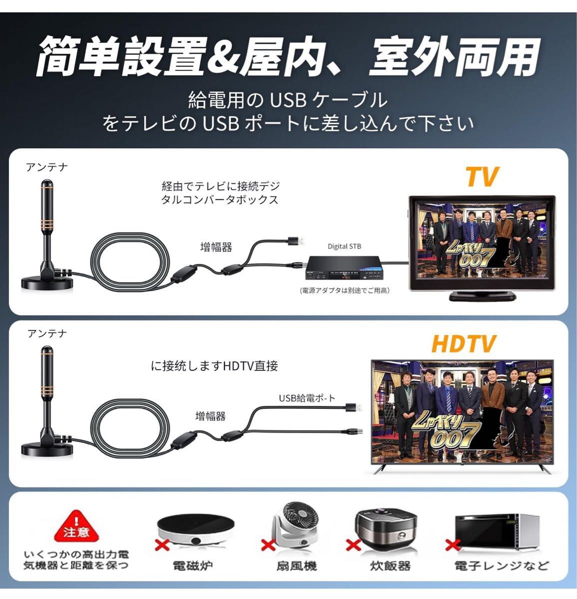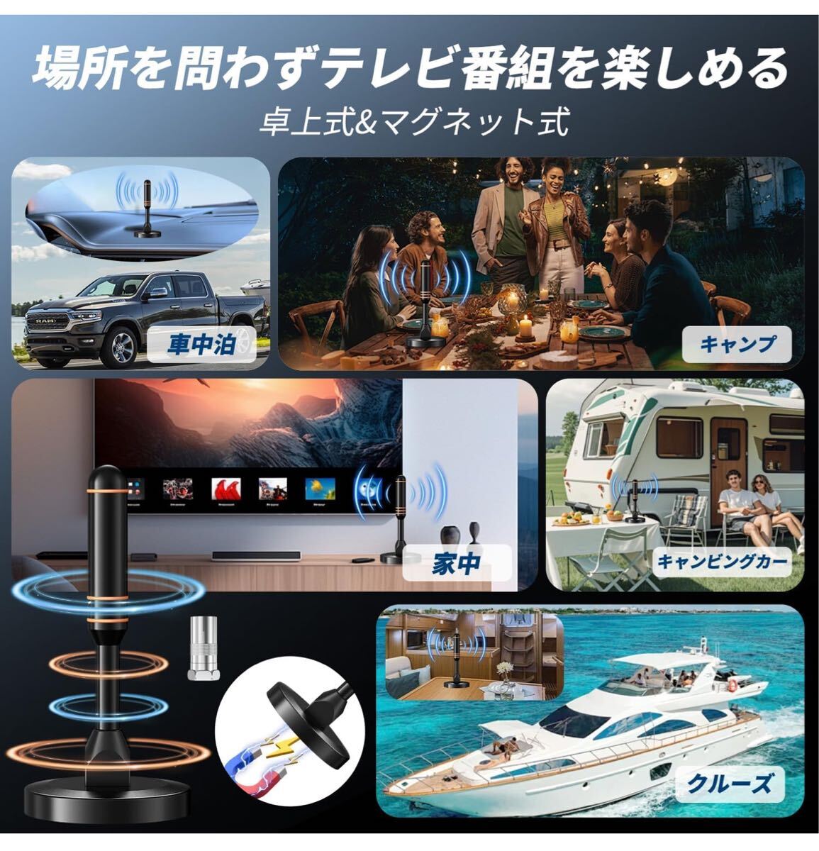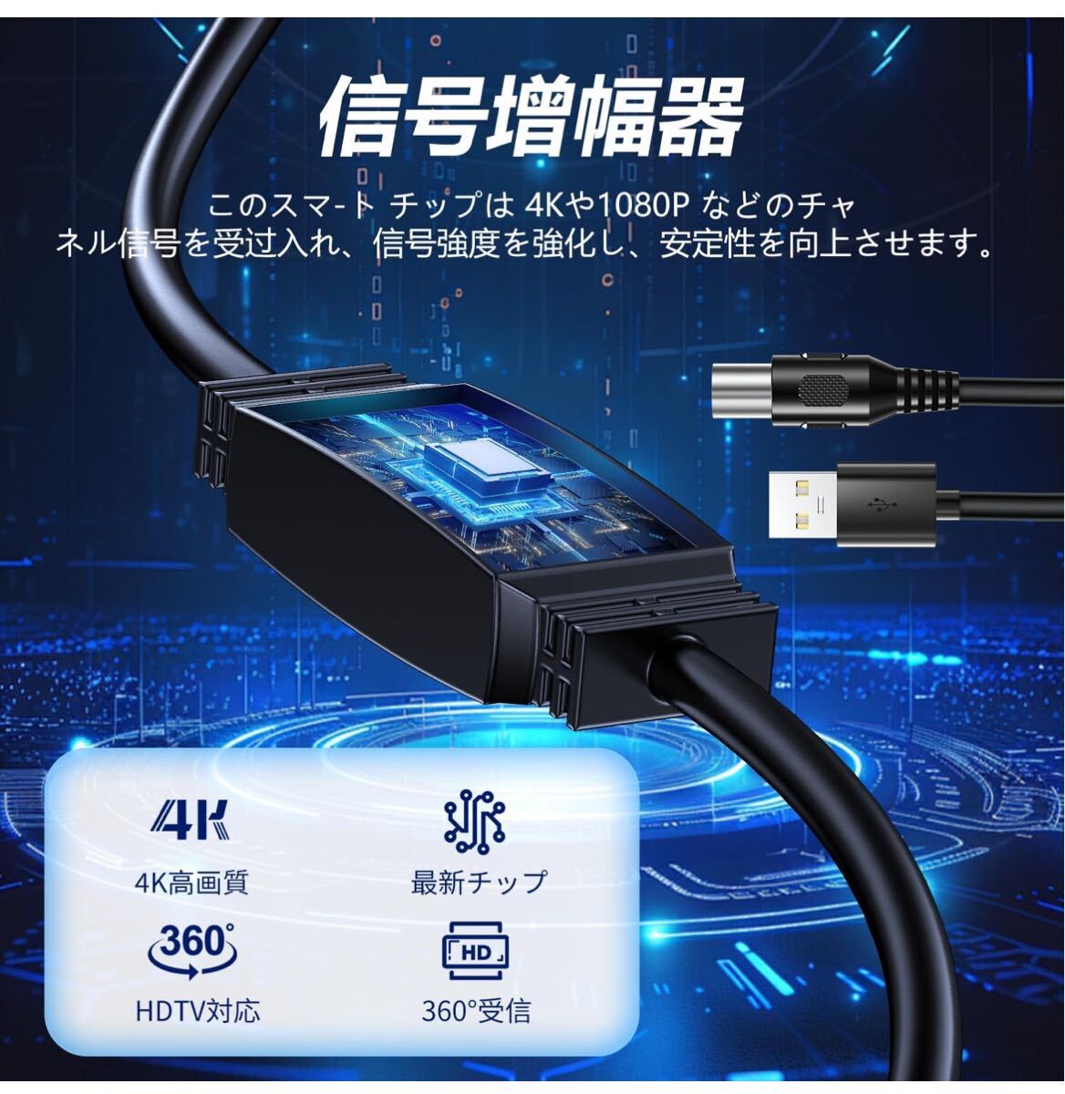「屋内・屋外両用」360度全方位受信機能を備え、あらゆる方向からの電波を受信可能。さらに、独自開発の高性能信号増幅器を内蔵しており、アンテナの受信能力を3倍に向上させます。ご使用中に問題が生じた場合は、いつでもご相談ください。