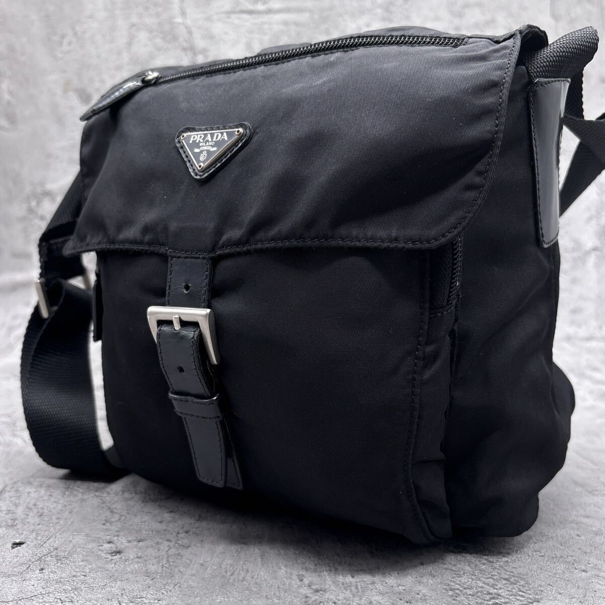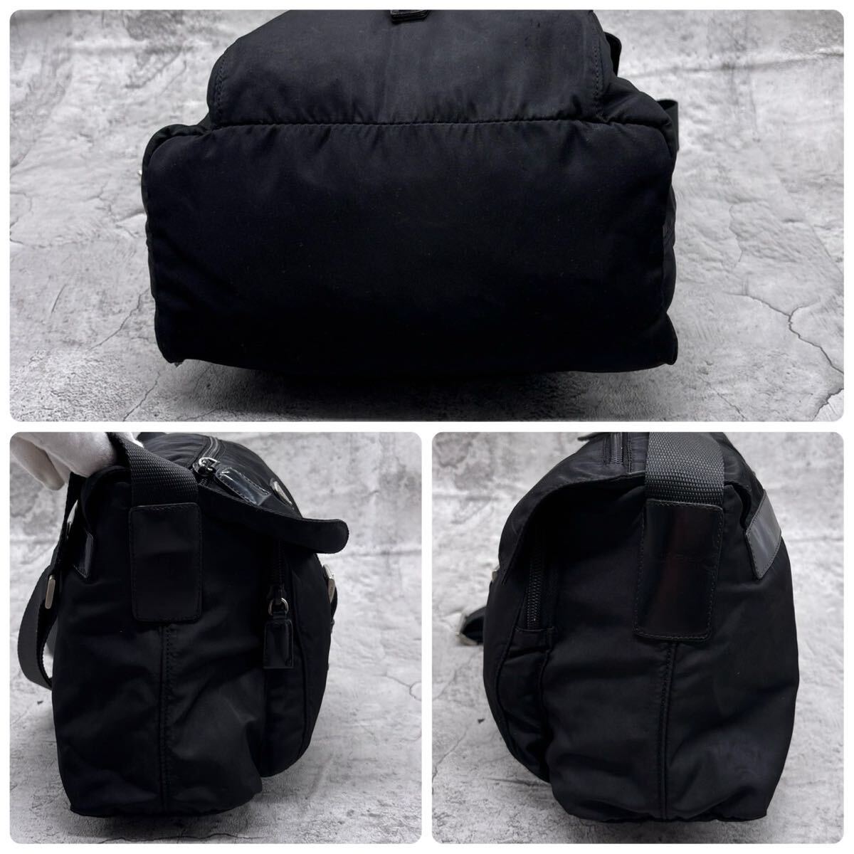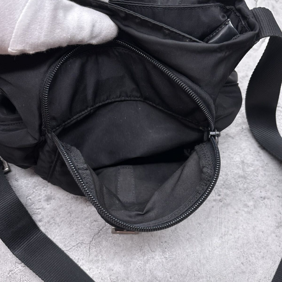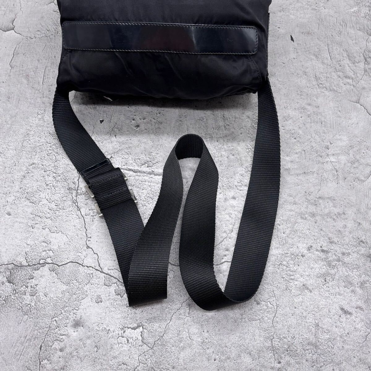 【美品】PRADA プラダ ショルダーバッグ 三角 トライアングル ロゴ 白タグ ブラック 黒 テスートナイロン 本革 クロス 斜め 肩掛け 肩がけ